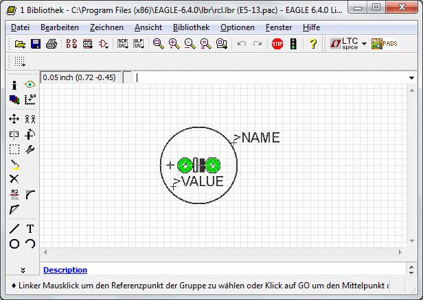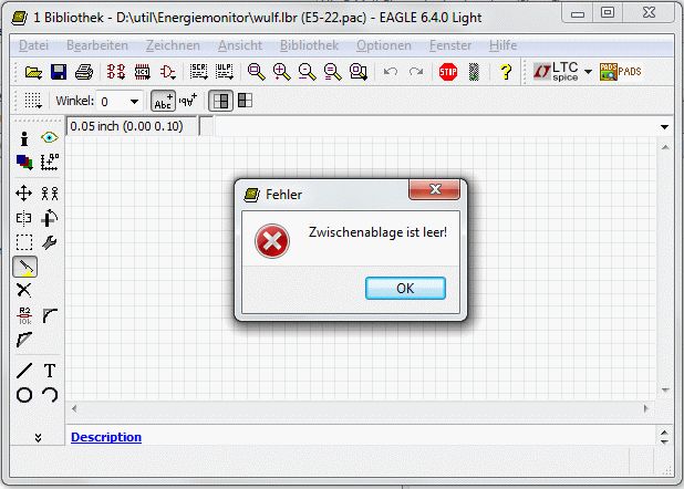 Geht bei mir einfach nicht. Habe eine kleine slide-show aus sechs screenshots erstellt. lib2 zeigt den Stand nach disp all group cut Will das Package eines Kondensators mit 5mm Rastermass und 13mm Außendurchmesser aus der rcl.lib in eine eigene Lib packen (habe bereits ein leeres Package darin erstellt) und dort den Durchmesser auff 22mm erweitern. Der kritische Punkt ist wohl das Öffnen der eigenen Lib: da scheint der Inhalt des Clipboards verloren, siehe Bild lib6