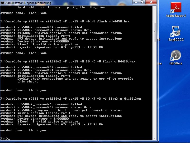 >Der >gleiche Fehler liegt auch vor, wenn ich die serierelle Schnittstelle >(RS232) zum Programmieren verwende. Hier wird mir auch Angezeigt, dass >die Initialisierung des Attiny2313 0x000000 sei. "die Initialisierung" ist die Signatur des ATTiny. Weil du -F angegeben hast wird dir vorgegaukelt das sie gelesen wird. Wird sie aber nicht weil du noch gar keine Verbindung zum Programmer hast. So, alles noch mal auf Anfang: -F weglassen -D weglassen Für einen COM Port gibt man auch immer eine Baudrate ein. Die fehlt bei dir. Dein Programmer wird mit com15 im Gerätemanager angezeigt? Es liegt Spannung am ATTiny an? Beantworte die Fragen oder ich bin weg.