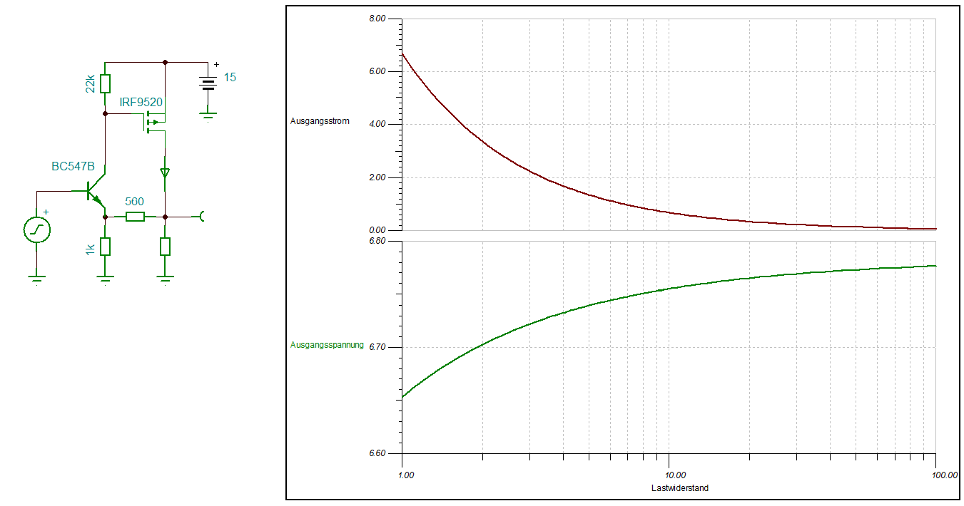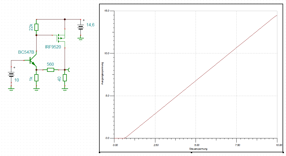 > ich hab das genau nach der Schaltung gebaut!Aber es funktioniert nicht. > Beim messen der BAhn kommt es etwa hin mit der Spannung! Kaum lege ich > ein Auto auf die Bahn bricht die Spannung ein. Dann stimmt deine Schaltung eben nicht. Sicher, dass die Transistoren richtig angeschlossen sind? Zeig mal ein Foto vom Aufbau. Die Schaltung ist recht stabil. Im Bild sieht man, dass erst bei ca. 5A Ausgangsstrom die Ausgangsspannung um 0,1V einbricht. Die Ua=6,7V ist jetzt willkürlich etwa in der Mitte der Kennlinie gewählt.