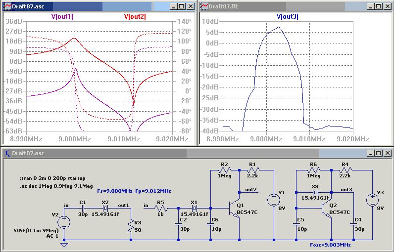 B e r n d W. schrieb: > In dem angehängten Beispiel sieht man, dass die Serienresonanz bei > 9.000MHz liegt und die Parallelresonanz bei ca. 9.012MHz (out1). Das sind aber 2 unterschiedliche Schaltungen wobei einige pF das Quarz auch etwas "ziehen" könnten (z.B. durch Transistorkapazitäten)?