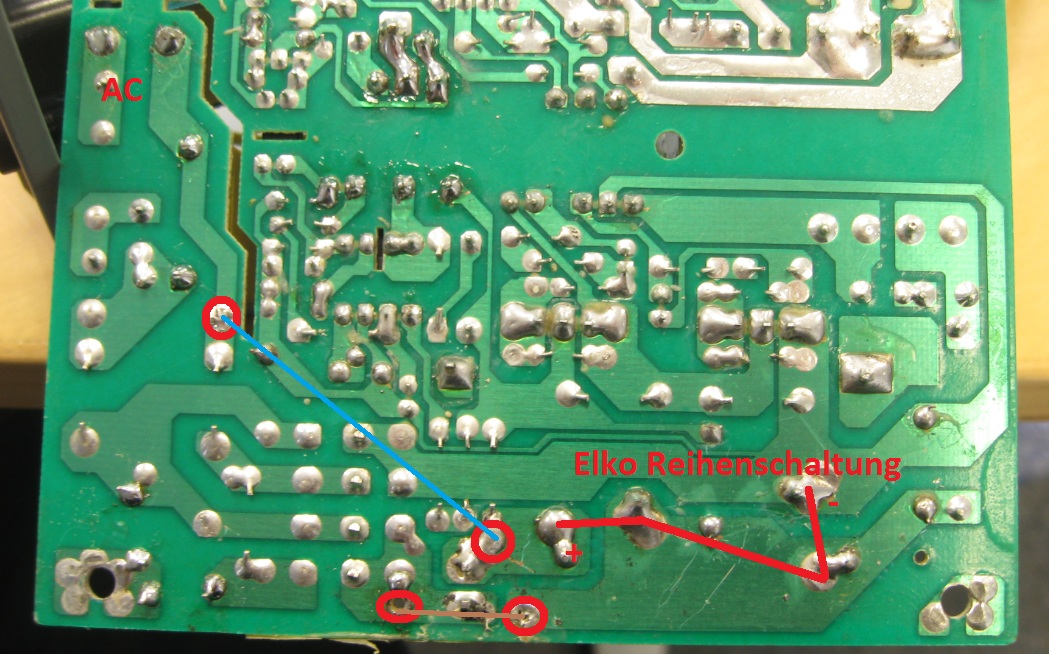 Hallo, ich habe ein PC-Netzteil mit dem typischen roten Schalter, der zwischen 115 V mit Spannungsverdoppler oder 230 V ohne Spannungsverdoppler umschalten sollte. Was mich aber irritiert ist, dass der Schalter schließt, wenn er auf 230 V steht, was ja eigentlich bei 115 V der Fall sein sollte, da er ja am Mittelpunkt zwischen den Elkos bzw. am Eingang des zweiten Elkos eine Verbindung schaffen muss. Leider weiß ich nicht mehr genau, wie die einzelnen Leitungen vom Schalter mit der Platine verbunden waren, will das Netzteil aber quasi ohne den Schalter konstant am 230-V-Netz betreiben (hatte gedacht, dass müsste dann komplett ohne Schalter seinm weil er wie gesagt eigentlich öffnen müsste). Im Bild sehr ihr die 4 Lötaugen in roten Kreisen, an denen jeweils 1x Phase oder 1x Neutral verbunden waren. Die Frage ist also wieso das mit dem Schalter so gelöst wurde und ob ihr das zusammenbekommt, wie ich die 4 Lötaugen miteinander verbinden muss, um die 230 V Tauglichkeit herzustellen. Vielen Dank.