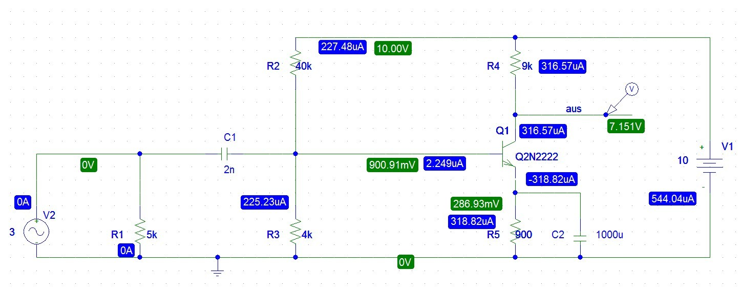 Hallo Allerseits! Ich habe ein paar Probleme mit PSPice, da es mir anscheinend irgendwie irrwitzige Werte liefert die so nicht sonderlich stimmen können. In dem ersten Bild (schaltung.png) ist die Schaltung zu sehen. Eigentlich ist es ja eine Emitterschaltung, somit wäre ja eigentlich der Emitter der Ausgang. JEDOCH, bekomme ich da keine sonderlich guten Werte. Denn die linke Grenzfrequenz erreiche ich nicht, da die irgendwo nahe Null liegt (Bild: emitter.png). Also zweiter Versuch und Probe an den Ausgang der auch laut Aufgabenstellung vorgesehen ist, an den Kollektor. Da sieht das alles schon teilweise besser aus (Bild: kollektor.png). Habe da 3 dB Frequenzen von 23 kHz und 5,6 MHz, ABER, ihr seht es wahrscheinlich schon. Die Spannung kann ja irgendwie unmöglich bei 260 V liegen. Daher mal hier meine Frage: Messe ich falsch, oder will PSpice mich nur auf den Arm nehmen? Gruß, me