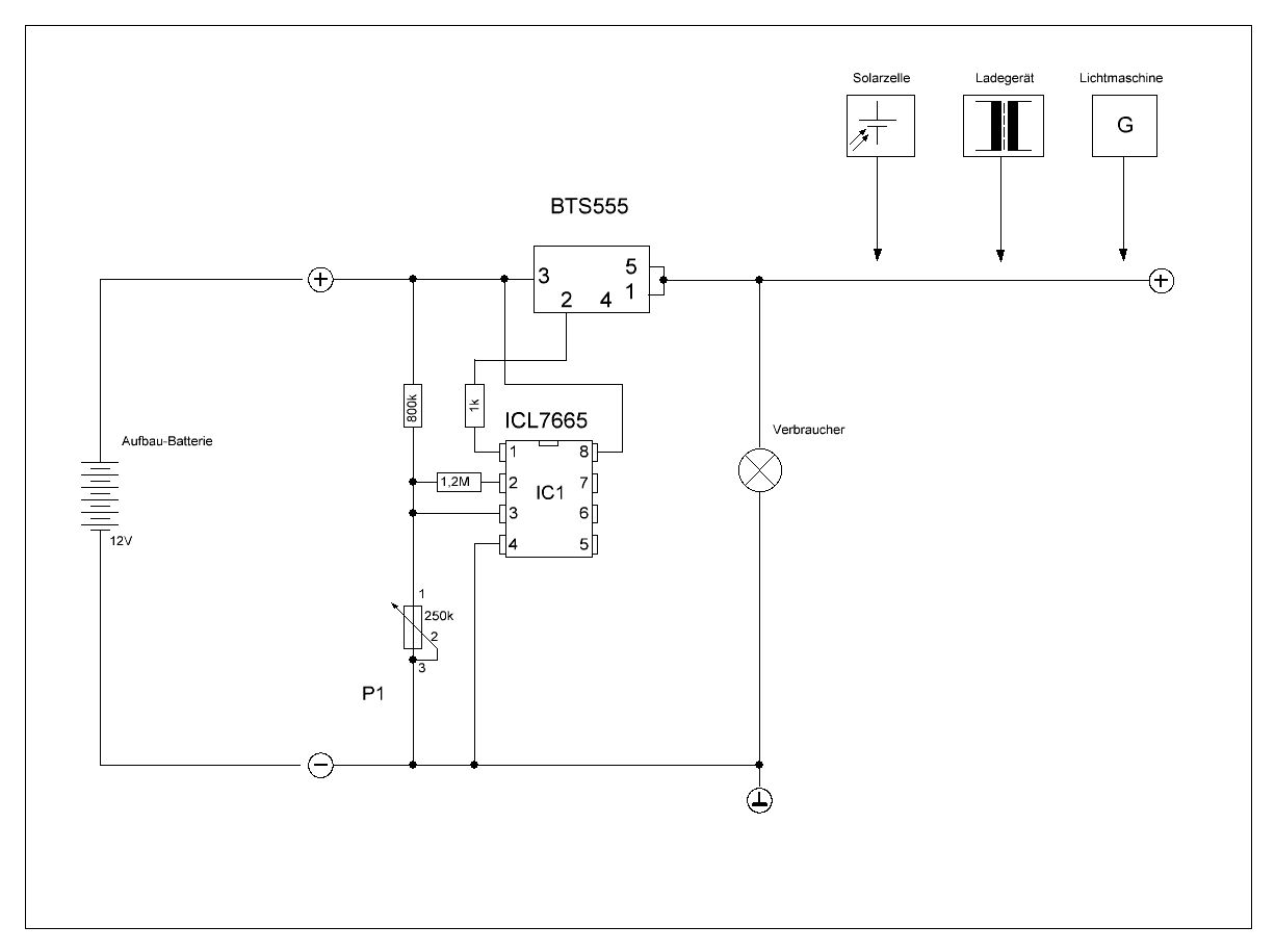 Hallo, nach vielen Jahren "Elektronik-Selbstbau-Abstinenz" möchte ich mich mal wieder an ein Projekt wagen. Der Grund ist ein im Wohnmobil wegen Tiefentladung "gestorbener" 110 AH Bleiakku. Nach intensiver Suche bin ich auf den PROFET BTS555 als Lastschalter gestoßen. Der passt genau zur KZF-Spannung, hat einen Ron von max. 2,5 mOhm und kann 320 A schalten. Für meinen Anwendungsfall reichen 40 A aus. Als Spannungswächter würde ich gerne den ICL7665 einsetzen. 4 Widerstände und 1 Blockkondensator am ICL7665 sowie der BTS555 auf einem Kühlkörper und fertig ist die Akkulebensversicherung. Aufgebaut hab ich's schon mal provisorisch und soweit funktioniert es auch. Hat der Akku weniger als 10,5 Volt trennt der Profet die Last vom Akku. Nur fehlt mir jetzt noch eine Idee wie man möglichst einfach den Profet dazu bringt, automatisch den Akku wieder zuzuschalten wenn z.B. die Solarzelle genügend "Saft" bringt ? Hat jemand eine Idee ? Und vielen Dank schon mal für hoffentlich viele hilfreiche Antworten. Dieter