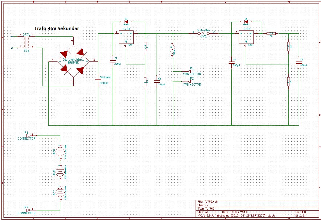 > wie kann ich diesen nun sinnvoll begrenzen Trafo nehmen der von selbst den Strom begrenzt (Prinzip Klingeltrafo oder eben Bleiakkuladertrafo). Vorwiderstand zwischen Gleichrichter und TL783. oder +-----+ ----| |--+---+---- +-----+ | | | 240R | | | | +-----+ Akku | | | | 8k | | | | | +---+----- | | BC546 >|-1k-+ E| | | 1Ohm | | -------+-----+