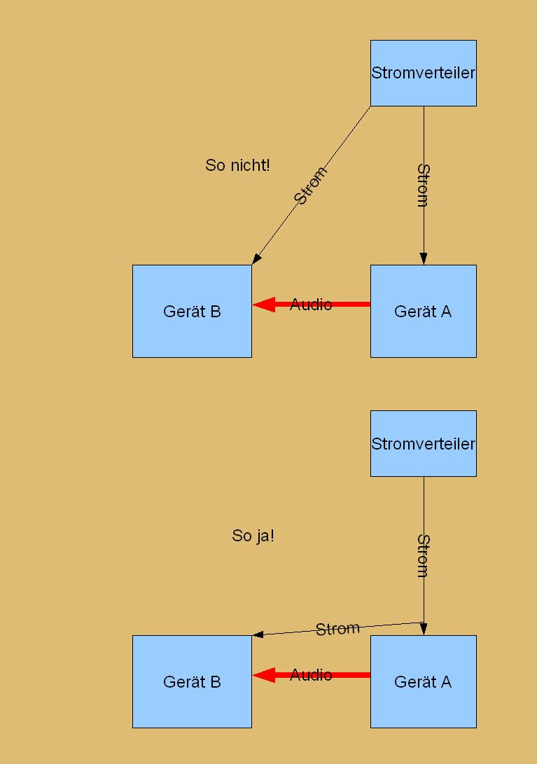 Hallo, wir verwenden bei unseren Theateraufführungen einen PC als Soundquelle der dann auf ein Powermixer geht. Hier gibt es auch hin und wieder Brumstörungen auch wenn PC und Mixer an der selben Steckdose angeschlossen sind. Wirksamer Notbehelf: Leitung 6qmm vom PC Gehäuse zum Mixergehäuse. Bessere Lösung besonders wenn die Leitungen länger sind: D-I Box besorgen, die die asymetrische Signale der Soundkarte in symetrische Signale konvertiert. (z.B 55,- bei Thomann.de) Da ein Übertrager und ein sog. Groundlift Schalter eingebaut ist sollte es damit keine Brumstörungen mehr geben Gruß Jürgen