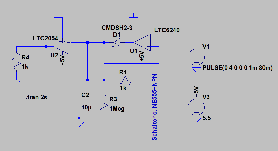 Mir ist heute Nacht eine kleine Schaltung eingefallen... ich habe eine Current Sense Schaltung die mir recht flotte Strompulse misst (~1 ms) und mit in 1V/A ausgibt - bis max 5A. Nun muss ich aber stets ein Oszi rumschleppen um zu sehen was geschieht. Jetzt dachte ich könnte doch auch so ein digitales Einbau-Voltmeter DVM benutzen. Natürlich ist deren zeitliche Auflösung viel zu gering und ich würde gleich zweimal nichts sehen. Also habe ich diese kleine Schaltung erträumt. Ich wollte einen Kondensator laden und dann eben die maximale Spannung auf dem C über das DVM ablesen. Nun muss eine Diode her die die Richtung klar macht. Leider handle ich mir den Spannungsabfall ein. Kurzum habe ich den LTC6240 herumgebaut. So nun wird der Kondesator geladen. Damit ich aber auch die Spannung am Kondensator auslesen kann ohne ihn gleich wieder zu entladen brauche ich einen zweiten OPAMP hier mal der LTC2054 (zugegeben der ist zu schwach auf der Brust, ich wollte schon immer mal einen dieser Zero-Drift OPAMPS haben ;) ). Ein simpler RESET Button entleert den Kondensator. Ob der 1MegOHM hineinkäme denke ich nicht. Klar muss der AusgangsOP etwas kräftiger werden vielleicht nehme ich auch einen LTC6240 der glaub kann bis zu 30mA ausspucken. Aber was mich interessiert ist, gibt es eine bessere / gängigere Lösung für mein Problem? Und wie unorthodox ist die Diode im Feedback? Grüße, Bernd