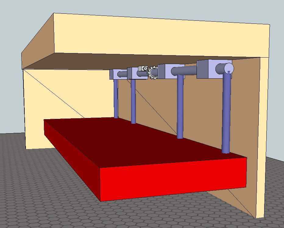 Ok ihr habe ja recht ;) Hab mal versucht die Sache zu skizzieren. Das soll für ein Faschingswagen sein. Das Problem an der ganzen Sache ist das ich kaum Platz habe um die ganze Mechanik unterzubringen. Das rote Rechteck ist das Gewicht. Vorkopf ist auch noch eine Wand die jetzt ausgeblendet ist. Die Welle soll dann eben über einen Motor und Zahnräder (wie im Bild angedeutet) angetrieben werden. Der Aufbau ist vom Boden bis zur oberen Kante der Kiste (gelbe Fläche) ca. 70cm groß. Die Breite auch ca. 70cm. Der Abstand zwischen dem Boden und der unteren Kante des Gewichtes beträgt ca. 10cm. Da das Gewicht eben sozusagwen komplett ein und ausgefahren werden soll - wie bei dem Bild am Anfangsposting zu sehen - habe ich leider kaum Platz für andere Mechaniken wie zb. die Sache über einen Linearmotor mit Spindel zu heben. Auch mit Gegengewichten wirds schwer - weil wohin soll der Hebel mit dem Gegengewicht ? Ich müsste das Gegengewicht irgendwie mit Seilen umlenken oder so ... Auf jedenfall wird darin die Lösung liegen ein Gegengewicht zu nehmen, dann wie ihr schon sagt die 525Nm Drehmoment sind für ne Low-Cost-lösung einfach zu viel. Und selbst wenn man was finden würde, dann währe die Sache warscheinlich höchst instabil :( Ich hoffe ich konnte die Sache bisschen mehr erklähren, ich werd mir mal paar Gedanken über das Gegengewicht machen und die Sache dann nochmal mit einer neuen Skizze zeigen. Vielen Dank soweit erst mal. Wie gesagt von oben soll da nix gehoben werden auch wenns leichter ist. Der hebemechanismus soll sozusagen nicht zu sehen sein. Eine Sache noch: Ich hab mal nach Scheibenwischermotoren für LKW's gesucht und welche für um die 130€ gefunden bei so Ersatzteilläden. Leider habe ich dort nie eine Angabe über das Drehmoment gefunden. Aber selbst wenn die halb so stark währen wie die KFZ Scheibenwischermotoren währe es ja auch nur ein Tropfen auf den heißen Stein. Eine weitere alternative (aber auch im grunde nix anderes) währe vieleicht ein Motor für einen Garagenantrieb :)