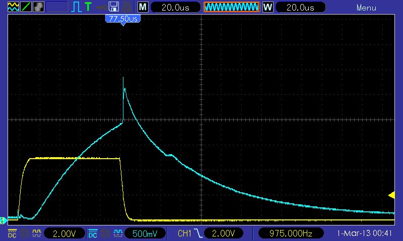 Hi, ich versuche mich gerade an einem RGB Moodlight mit Touchkontrolle. Dabei handelt es sich um ein Glaskugel (ähnlich dieser Ikea Tischleuchte (http://www.ikea.com/de/de/catalog/products/80096372/)). Jedenfalls möchte ich das Touchinterface per Infrarot umsetzen. Das Kugel ist aber relativ "groß" und matt, dementsprechend hart tue ich mir mit dem Ganzen. Im "Nahbereich" (wenige Zentimeter) fällt der Effekt viel (!) deutlicher aus. Leider bin ich was die Auswertung von analogen Signalen ausgeht absolut unerfahren bzw. unbeholfen. Ich habe jetzt ein wenig herumexperimentiert und dabei sind die Aufnahmen im Anhang entstanden. Kanal 1 (gelb) ist dabei der Puls der Infrarot LED. Kanal 2 (blau) stellt den Pegel an einem Phototransitor dar. Das eine (normal.gif) stellt den Normalzustand dar, das zweite (touched.gif) den Zustand, wenn man die Kugel mit der Hand berührt. Wie man sieht ist der Effekt relativ klein. Die Spitze verschiebt sich im angefassten Zustand um etwa 100 mV nach oben. Das ist halt nicht unbedingt viel. Andererseits ist es relativ unempfindlich gegen Umgebungslicht, da ich die Infrarot LED ja pulse. Ich schicke momentan etwa 200 mA durch die LED. Laut Datenblatt sind bei einem Dutycycle von 1 % bis zu 1 A möglich. Ich werde natürlich noch testen inwiefern es dadurch besser wird. Allerdings möchte die Bauteile ich nicht unbedingt am Limit betreiben. Jetzt würde ich gerne fragen, ob und wie ich das Ganze aufbereiten kann, um es mit einem Mikrocontroller auszuwerten? Habt ihr Ideen, Vorschläge bzw. entsprechende Stichwörter? Vielen Dank!