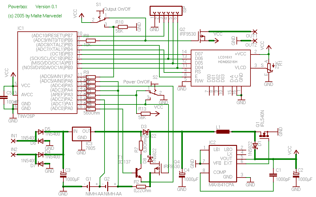 >Der Mosfet wird doch "gebootstraped", d.h. er wird mit den erzeugten 5 >Volt versorgt, wie der Schaltregler selbst. Nach meiner Logik sitzt der Mosfet am Pluspol der Accus, also etwa bei 2,4V. Ich hätte also wahlweise 2..2,6V gegenüber GND oder 2,4..3V gegenüber VCC. >Warum gehst Du mit dem Ausgang von 7805 nicht gleich auf VCC? Stimmt, darauf bin ich irgendwie nicht gekommen. Die Diode um den 7805 zu schützen dürfte nicht das Problem sein, nur den MAX641 möchte ich ungern auch eine Diode geben, da dies die Effizienz im Accu Betrieb weiter verringern würde. Über einen Shut-Down des MAX641 habe ich nichts im Datenblatt gefunden.