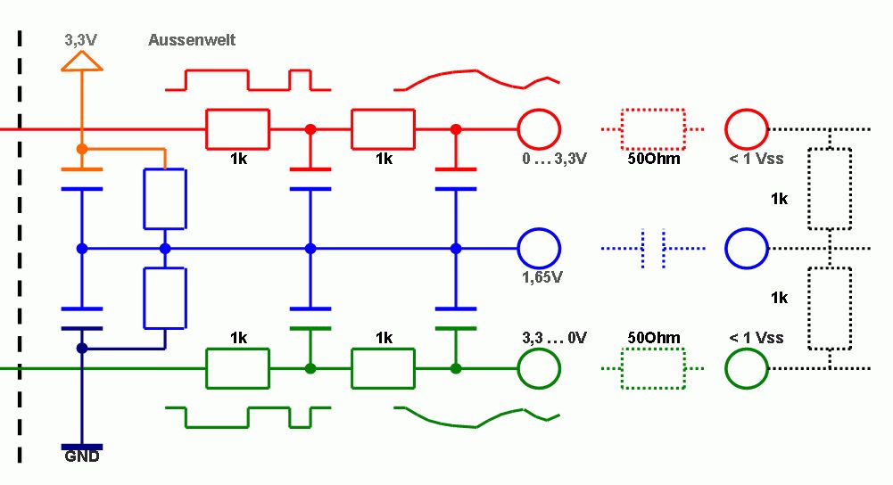So, wie Deine Signale aussehen, wills Du einen analogen Eingang treiben und Deine digitalen Ausgänge filtern? Bist Du sicher, dass Dein Eingang so aussieht? Meistens ist das doch ein Differenzverstärker und dessen Aufgabe ist es ja gerade, die Differenz, die Du erzeugst, potenzialunabhängig zu verstärken (und dies tut er für gewöhnlich auch - abgesehen von seinem common mode Anteil, den er nun mal hat.) Damit brauchst Du keine Masse mitzuliefern! Was sollte er auch damit anfangen? Im Gegenteil: Das Endgerät hat seinen eigene Masse und die dürfte in diesem Fall im Bereich Deiner Digitalmasse liegen. Deine Kunstmasse kann er garnicht verarbeiten. Wenn Du die für andere Zwecke benötigst, solltest Du sie auch besser mit Spannungsregelung ausführen, also mit zumindest einem OP. Ausserdem sehe ich noch einen Fehler: Der Eingang dürfte sich auf 1Vss mit 1kOhm (insgesamt an den beiden Polen "plus" und "minus") beziehen, weswegen der Spannungsteiler nicht stimmt. Du musst wechselstrommässig beide Zweige parallel sehen, woraus sich jeweils 2kOhm und damit 1k ergeben - ohmsch betrachtet. Zudem sollte Dein Eingang auch noch eine Eingangskapazität besitzen. Die kannst Du deinem letzten Kondensator rechnerisch parallel schalten. Realistischer ist ohnehin die Annahme, dass Deine Ausgänge zwischen 0,2V und 3,1V schalten, also etwa 3V Hub haben. Du musst gleichspannungsmässig auf 3:1 herunter und wechselspannungsmässig schauen, dass Deine Grenzfrequenzen stimmen, also die Deiner Schaltung deutlich grösser ist, als die des Instrumentes und gleichzeitig wiederm deutlich geringer, als Deine PWM-Frequenz. Wenn das nicht stimmt, musst Du es genauer ausrechnen und / oder simulieren. Ich würde aber nicht den Eingangswiderstand des Messgerätes allein verwenden, sondern noch etwas parallel schalten und entsprechend niederohmiger werden. Dann hast Du etwas Toleranz.