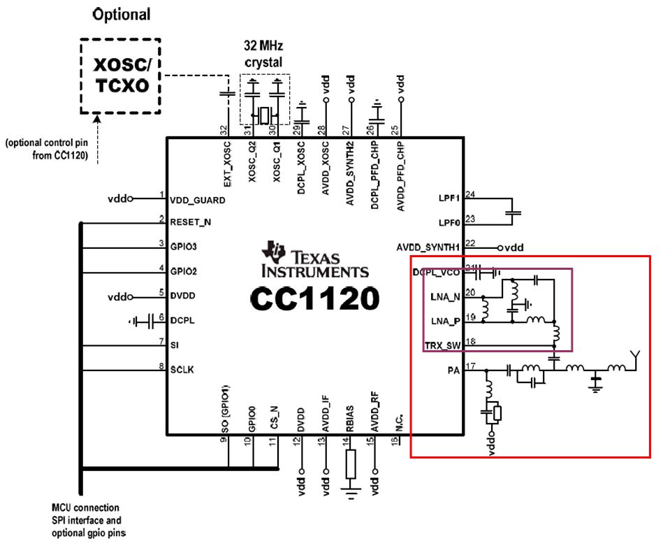 Hallo zusammen, ich befasse mich gerade im Rahmen einer Projektarbeit mit einem RF-Transceicer, dem CC1120 von TI. Bin in der gesamten Materie ein Anfänger. Als Anhang habe ich die Beschaltung und einen Auszug aus dem Blockschaltbild angefügt. Folgende Fragen zum Empfangsteil des TRX habe ich: Die Antenne wird ja per Switch zwischen Empfangsteil und Sendeteil umgeschaltet. Was hat es mit der jeweiligen Beschaltung aufsich? Ist die beschaltung des RX-Teils ein Bandpass? Wofür? Warum hat der LNA zwei Eingänge? Das Datenbaltt von TI erklärt hier leider sehr wenig bzw. nichts. Der Atmel ATA5830 hat ebenfalls zwei LNA-Eingänge, hier ist mir bekannt dass der eine Pfad für das Low-band (315/434MHz) und der zweite für das High-band (868MHz)dient. Bei der internen Schaltung handelt es sich ja um einen Superhet. warum gibt es allerdings zwei Pfade (). Soweit ich herausgefunden habe sind die Signale des Frequency Synthesizer´s I für In-Phase und Q für Quadrature-phase (also 90° phasenverschoben), diese werden mit den Eingangssignalen gemischt. Aber warum? Kann mir vielleicht jemand die externe Beschaltung und den inneren Signalfluss grundsätzlich erklären? Oder eine einfache Lektüre empfehlen? Leider finde ich hierzu nichts genaues, weiß auch nicht genau nach welchen Begriffen ich suchen soll. Für Hilfe wäre ich Euch sehr dankbar! Gruß Chris