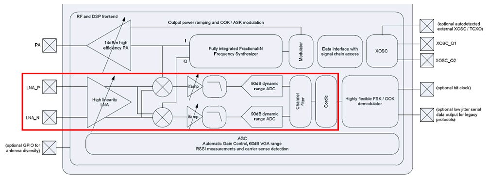 Das ist kein Superhet (es gibt keine Zwischenfrequenz), sondern ein I/Q Direktmischer. Die beiden Ausgangssignale an den ADC-Eingängen sind niederfrequent bis DC herunter. Der Cordic-Algorithmus berechnet daraus vermutlich Amplitude und Phase (Pythagoras und Arcustangens). Der LNA hat symmetrische Eingänge, die Außenbeschaltung macht eine Anpassung an die unsymmetrische Antenne. Außerdem mischt sie den Senderausgang dazu, das ganze soll auch noch 50 Ohm am Anschluß haben. Für den RFM12 habe ich das Anpassnetzwerk mal hier beschrieben http://www.mikrocontroller.net/articles/RFM12#Antennen-Anpa.C3.9Fnetzwerk
