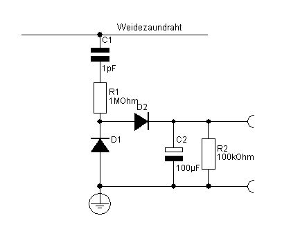 Der Impuls wird auch kein sauberer Einzelimpuls sein, sondern eher eine abklingende Schwingung, weil der Trafo der die Spannung hochtransformiert zwischen den Windungen parasitäre Kapazitäten hat und vielleicht sogar noch auf der Primärseite ein Kondensator parallelgeschaltet ist. Und der lange Draht auf der Wiese, wird auch eine Eigenresonanz haben. Also müßte die Hochspannung erst mal gleichgerichtet werden.