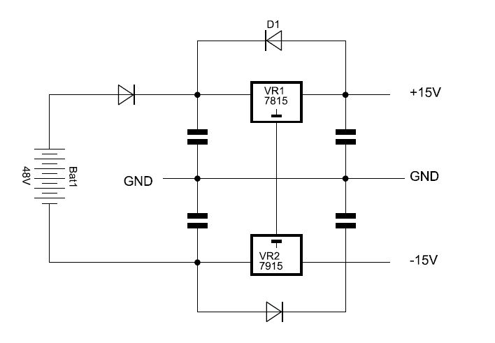 Noch was: Brauchst Du wirklich eine symmetrische Versorgungsspannung? Es wäre ja auch denkbar, dass der Verstärker auch mit einer einfachen +30V Versorgungsspannung betrieben werden kann und lediglicht eine Referenzspannung ungefährt in der Mitte braucht. Das wäre wesentlich einfacher realisierbar, zum Beispiel so wie ich das bei meinem Audio-Limiter mit Hilfe einer Zenerdiode realisiert habe: http://stefanfrings.de/audio_limiter/index.html Man könnte die Referenzspannung auch mit einem Spannungsteiler und nachgeschaltetem Spannungsfolger (OP-AMP) realisieren. Die Gretchenfrage ist: Brauchst Du wirklich einen GND in der Mitte zwischen der positiven und negativen Versorgungsspannung?