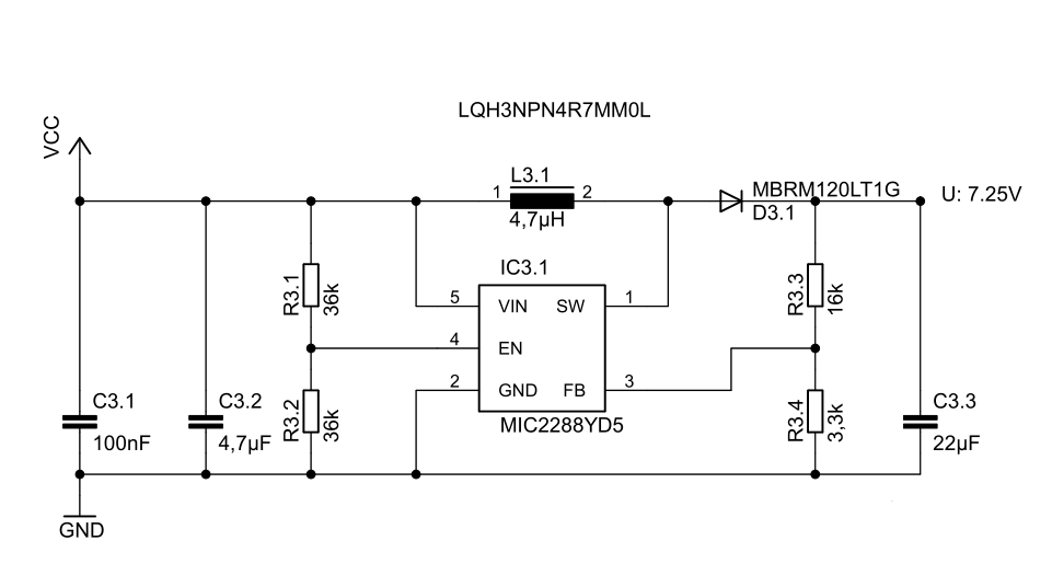 Moin! Kennt jemand ein gutes (günstig, einfache Beschaltung) Schaltregler-IC für diese Anforderung: Eingang: 3,3V - 4,2V (LiPo Akku) Ausgang: 7V, 500mA Die Belastung schwankt zwischen ~10-500mA, Dauerbetrieb bei Volllast muss aber auch funktionieren. Leider erfolglos war ein Versuch mit einem MIC2288 im SOT-23 Gehäuse: www.micrel.com/_PDF/mic2288.pdf Den Schaltplan habe ich mal angehangen. Bei ~200mA Laststrom schaltet das IC nach 2-3 Sekunden ab (Gehäuse überhitzt). Kann man die Schaltung noch mit anderen Bauteilwerten/anderem IC "retten" oder hab ich mit dem Teil einmal daneben gelangt? Alternativ suche ich ein besser geeignetes IC... Grüße Leo-A.