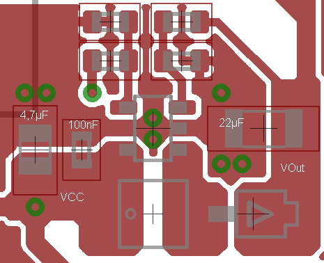 Foto vom Aufbau kann ich frühestens morgen machen, hab ersatzweise mal einen Screenshot vom Layout angehängt. Spule ist nach dem Beispiel aus dem Datenblatt, 4,7µH bzw. konkret LQH3NPN4R7MM0L. Die Kondensatoren sind X5R Keramik mit 10V/16V Spannungsfestigkeit, Werte auch hier nach Datenblatt. Wahrscheinlich wird das IC wirklich einfach zu warm. Bis ~250mA Last läuft der Regler stabil, danach steigt die Stromaufnahme stark an bis er sich irgendwann abschaltet.
