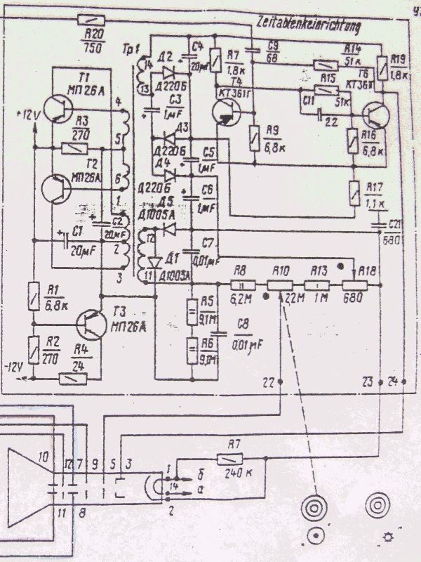 Nach längerer Pause habe ich vor einigen Tagen ein C1-94 (Baujahr 1983) in Betrieb nehmen wollen, aber leider blieb die Röhre dunkel. Diagnose: Hochspannung fehlt, der Oszillator, der die Hochspannung und die Betriebsspannung für den Aufhelltrigger erzeugt, schwingt nicht. Bei einer Überprüfung der Bauteile stellte sich heraus, daß sämtliche Widerstände, Kondensatoren und Transistoren (T1, T2 und T3) sowie der Trafo für sich genommen in Ordnung sind. Ich habe trotzdem die Kondensatoren C1, C2 und C4 ersetzt und die russischen Germanium-pnp-Transistoren MP26A gegen BC161 ausgetauscht. Kein Ergebnis! Erst nachdem ich parallel zu C2 einen Widerstand von 1,2kOhm eingelötet hatte, schwang der Oszillator und die Betriebsspannungen für die Anzeigeröhre wurden generiert. Das Problem hierbei ist jedoch der hohe Strom, der zusätzlich gezogen wird: An dem neu eingebauten Widerstand fallen ca. 22 Volt ab. Das bedeutet bei 1,2kOhm einen zusätzlicher Strom von ca. 18 mA, den die Spannungsversorgung verkraften muß. Könnte man eventuell durch Erhöhen des Basiswiderstands R3 (270 Ohm) einen automatischen Anlauf des Oszillators erreichen, oder würde das die Transistoren ins Jenseits befördern?