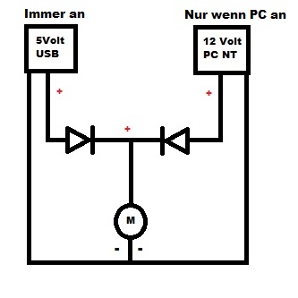 Hallo Ich habe Gestern ein Auftrag bekommen und zwar: Geht es um ein 200mm Lüfter der immer Laufen soll. Also normal Läuft der Lüfter über 12 Volt vom PC Netzteil. Jetzt muss der Lüfter aber langsam weiter Laufen. Auch wenn der PC ausgeht. Da kahm mir die idee (siehe bild) den USB zu verwenden jetzt wohle ich nur noch mal wissen obs alles richtig ist. PS.Ich weis das USB nur 100mA bringt das Reicht auch. DANKE