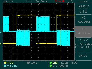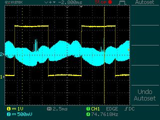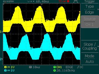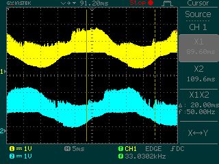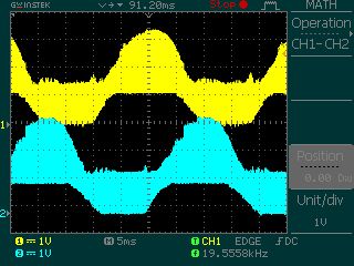 Das doch schon mal ne Information. Aber die negative Halbwelle sieht etwas kleiner aus als die Positive. Da das bei der Blockkommutierung auch so ist, solltest du mal gucken ob das n Messfehler ist oder n HW fehler. MfG Tec