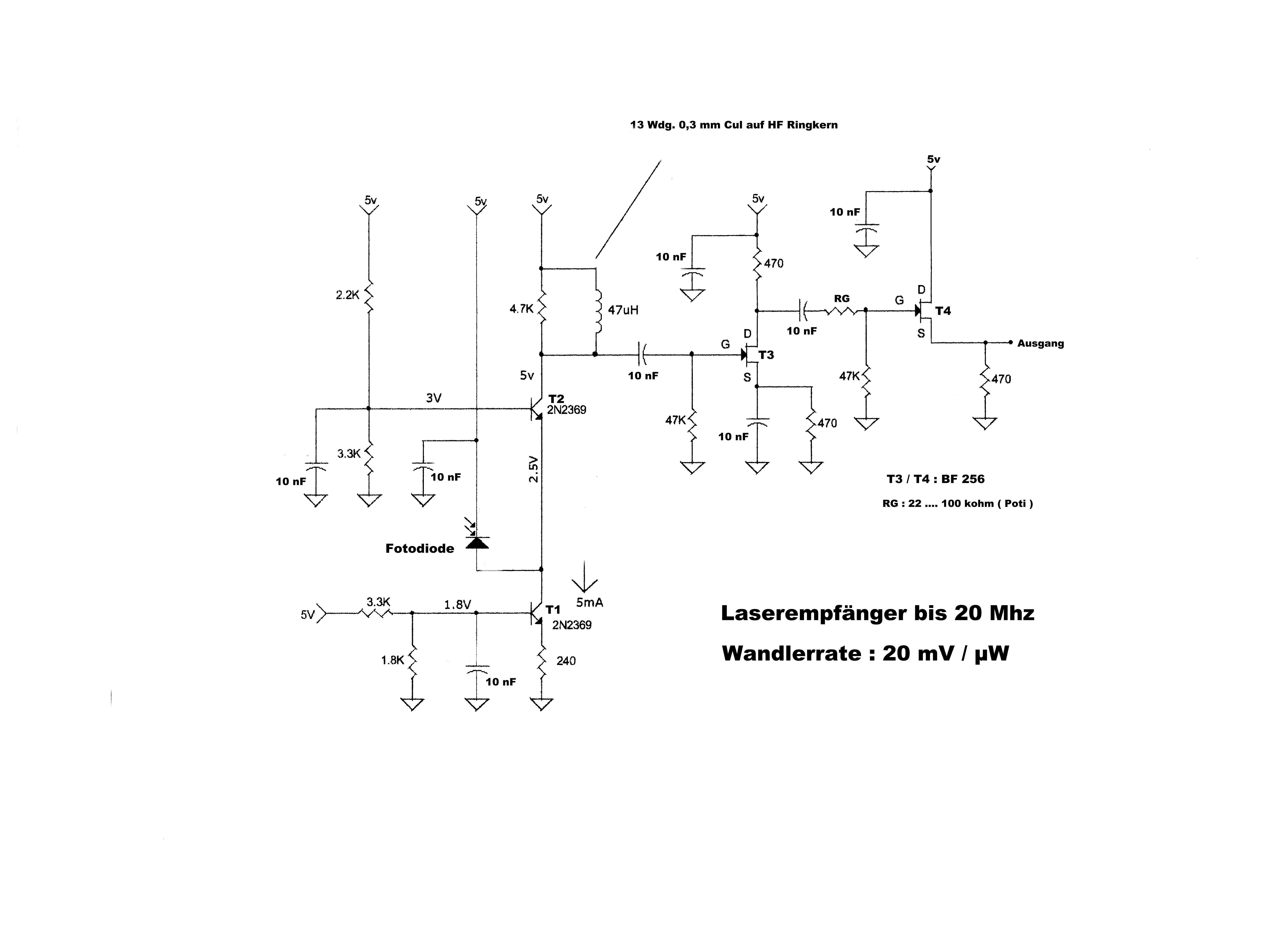 hier ne schaltung mit transis. war für nen laserlink o.ä. soll bis 20 mhz funktionieren. mfg