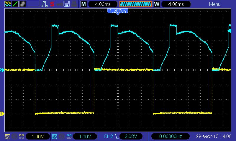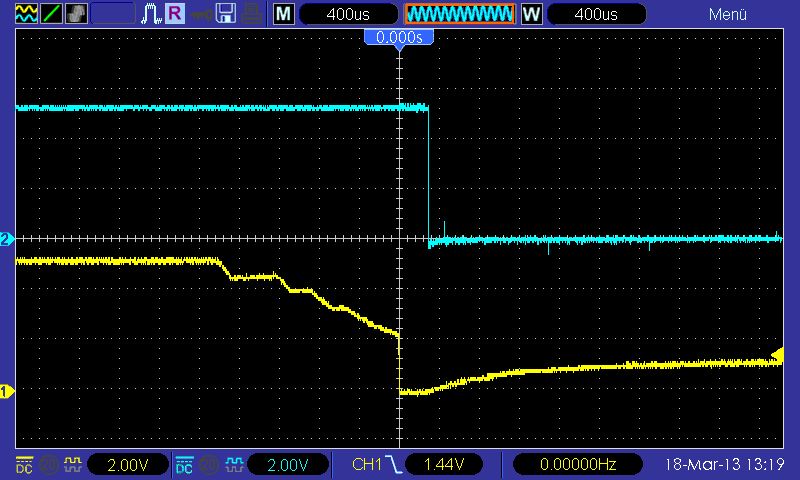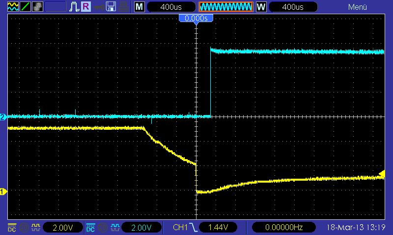 M. N. schrieb: > Hier wird es dennoch gemacht und zwar eine Kombination aus RC-Filterung > und Interruptauslösung und ein wenig Software, die dafür sorgt, dass die > Eingangshysterese des verwendeten µC-Eingangs auf nahezu Vcc erweitert > wird. RC ist überflüssig. Ich benutze den PCINT nur zum Aufwachen, dann kommt die übliche Entprellroutine. Und wenns nur ne Störung war, gehts eben nach 40ms wieder schlafen. M. N. schrieb: > Dies ist recht einfach und erlaubt ein schnelles, zuverlässiges > Einschalten des µC in ca. 2-3ms. Ja, das ist der "große" Nachteil meiner Schaltungen. Man drückt ne Taste und die LED leuchtet nicht nach 3ms sondern erst nach 40ms. Das muß wirklich tierisch nerven, in der Zeit kann man ja ne Zigarette rauchen. Ist in den 3ms die Hochlaufzeit des Bootstrap schon mit drin? Ich finde P-FETs jetzt nicht so teuer, daß sich Trickschaltungen lohnen. Bei hohen Strömen muß man auch beachten, das der N-FET ne Weile linear arbeitet und Leistung umsetzt. Ebenso beim Ausschalten. M. N. schrieb: > Blaue Kurve: PB3, gelbe Kurve: PB4 Die Lastspannung bei 24V/5A wäre mal interessant gewesen. Daß der MC ne LED fix schalten kann, ist klar.