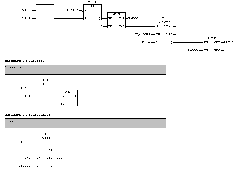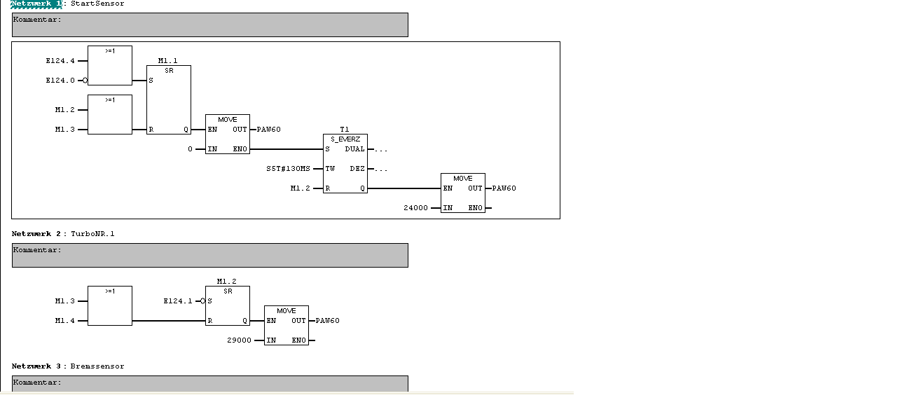 Hallo erstmal und danke schonmal für jede Hilfe. ensor Bahn 3,76 m Rundenzeit top 1.4 Sekunden 4 Sensoren http://www.conrad.de/ce/de/product/1...omSuggest=true E124.0 Sensot Start/brems E124.1 Sensor Turbo1 E124.2 Sensor Brems E124.3 Sensor Turbo2 E124.4 Starttaster/Rücksetzer beim Zähler Ich muss eine Carrera Bahn mit der SPS ansteuern. Das steuern geschieht analog über eine WagoKarte von 0-10 Volt. Die Bahn ist ganz einfach als Ellipse aufgebaut und hat 4 Sensoren. Ein Sensor am Startpunkt der auch dann als bremser benutzt wird,der zweite wird als turbo benutzt,dritter für das bremsen vor der Kurve und der vierte wird als turbo benutzt und 1 bremst das ganze wieder. Ich wollte das ganze in drei Modis fahren lassen z.B Anfänger profi Weltmeister. Ich hab schon ein kleines Programm geschrieben nur für die optimale Runde zu fahren. Wobei das Auto 20 Runden normal fährt und manchmal 1 Sensor überspringt. Ich weiß nicht woran das liegt, kann eine Fehlertoleranz sein vom Sensor. Meine Zykluszeit liegt bei 22ms und die Reaktionszeit habe ich 3ms genommen als Standart wert. Also kann das schon mal nicht sein das die CPU zu langsam ist! Wobei ich mir da nicht sicher bin, ob ich das mit der Reaktionszeit richtig gemacht hab.Das Programm habe ich nicht so schön geschrieben vielleicht habt ihr dafür ja auch besser ansetze. Habe alles im OB1 geschrieben. gruß hans