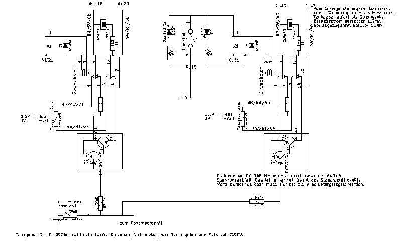Hallo Profis von Microcontroller.net. Ich als Elektronik-Anfänger (zumindest was das entwerfen betrifft, Kraftfahrzeugmechaniker) hab mal ne Fragen zum anhängendem Schaltbild. Ist es mit platzsparenden und einfachen Mittel möglich an den beiden BC 548 (Funktion als Stromsenke ca. 1mA) die anliegende Spannung vom Steuergerät bis auf 0,2 Volt zusammenbrechen zu lassen. Mir macht hier die normale Kollektor - Emitterspannung (645mV hier) Probleme, da das Anzeigensteuergerät erst 0,2V als "Tank leer" ansieht. Kann man die Transistorschaltung noch anders ausführen? Ich hab schon stundenlang gesucht und auch eine Fet - Schaltung mit OP in betracht gezogen, da fehlt mir aber das Wissen. Die obige Schaltung läuft simuliert gut, bis darauf, das die Spannung am BC 548 halt erst von 0,64 Volt losgeht müsste aber von 0,2V. Die Schaltung dient dazu das Tankgebersignal einer Autogasanlage (Tankgeber auch als Stromsenke geschalten, Im Gassteuergerät quasi nen Spannungsteiler) in das normale Kombiinstrument auf die Tankanzeige zu kriegen. Das Fahrzeug hat zwei Tankgeber als Poti ausgeführ und die beiden Transistorschaltungen sollen halt die Potis imitiren. Das ganze lässt sich per Schalter und Relais zwischen den Kraftstoffsorten umschalten. Also beide Tanklevel auf einer Anzeige. Für mich als Anfänger wär wahrscheinlich ne kleine Beispielschaltung am verständlichsten. Danke für eure Hilfe.