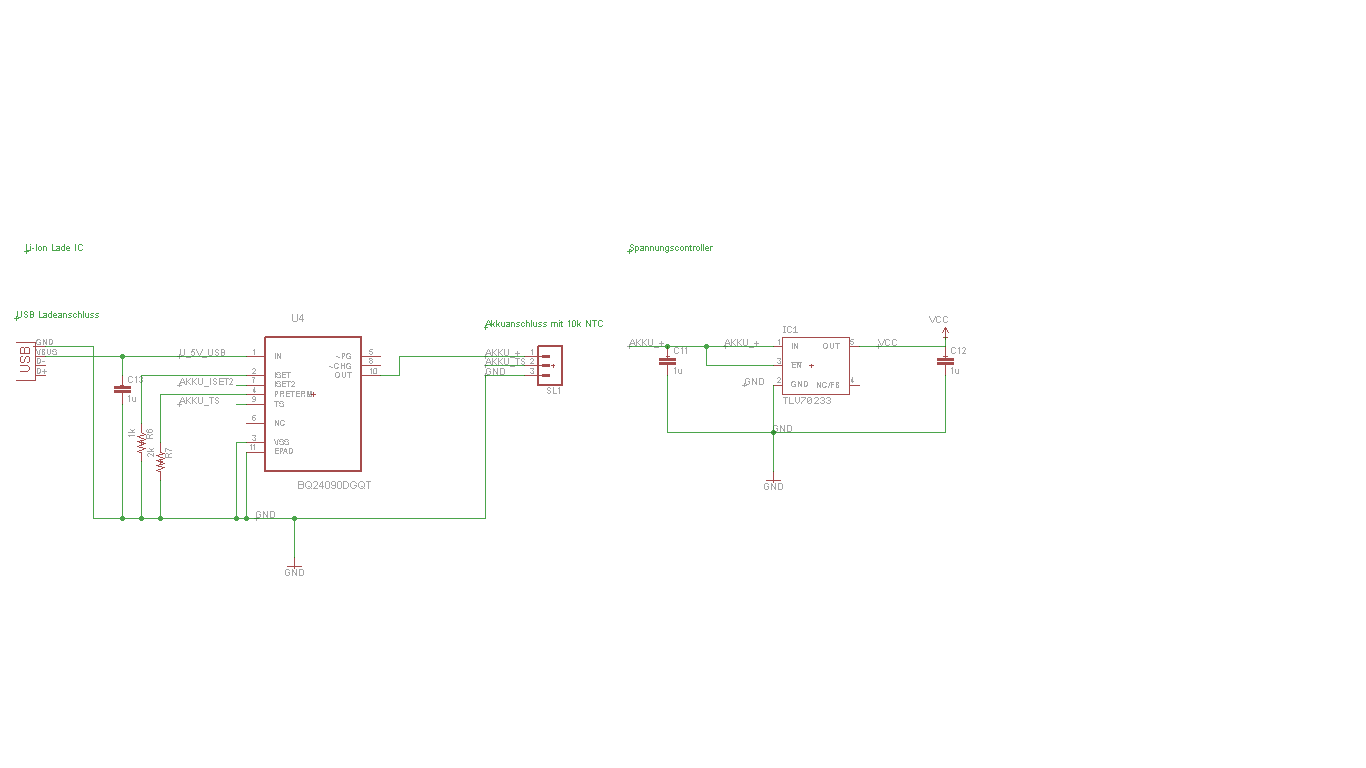 Hallo zusammen, Ich möchte ein kleines elektronisches Gerät mit einer einzelnen Li-Ion Zelle mit 3,7V betreiben (Link zum Zellentyp: http://www.panasonic.com/industrial/batteries-oem/oem/lithium-ion.aspx). Dazu möchte ich den Li-Ion Laderegler BQ24090 von Ti einsetzen. (Link zum Datenblatt: http://www.ti.com/lit/ds/symlink/bq24090.pdf ) Als Festspannungsregler setze ich den TLV70233 von TI ein. (Link zum Datenblatt: http://www.ti.com/lit/ds/symlink/tlv70233.pdf ) Nun habe ich zwei Verständnisfragen und da so ein Akku wie bei Boing gesehen ja brennen kann, möchte ich euch um Hilfe bitten. 1) Ich hatte vor die Spannung des Akkus (geht ja beim Laden bis 4.2V) durch den Mikrocontroller (betrieben durch die 3,3V) über einen ADC des MCU zu messen. Dazu hätte ich die Akkuspannung über einen Widerstandsteiler auf ein Level von ca 2.5V auf den ADC des MCU gelegt. Nun fließt ja über den Widerstandsteiler permanent ein sehr geringer Strom im nA Bereich. Somit entlädt sich der Li-Ion Akku permanent und irgendwann würde er somit in den kritischen Tiefenentladungsbereich von 2,5V kommen, wo der Akku Feuer fangen könnte. Gibt es hier eine einfache Schutzbeschaltung die den Akku bei einer Spannung kappt und wie eine Diode nur noch ein Laden durch den BQ24090 ermöglicht. Der eingesetzte Akku ist nämlich nur eine simple Zelle ohne Schutzbeschaltung. Schaltungsanregungen anderer Art sind selbstverständlich auch wilkommen. 2) Erfülle ich außer der mir bekannten fehlenden Unterschutzabschaltung alle erforderlichen Schutzmechanismen zum Betrieb von Li-Ion Zellen. Einsetzen tue ich wie aus dem Datenblatt des Ladecontrollers zu lesen: -6.6V Over-Voltage Protection -125°C Thermal Regulation; 150°C Thermal Shutdown Protection -OUT Short-Circuit Protection and ISET Short Detection -Fixed 10 Hour Safety Timer Für Hilfe wäre ich euch echt dankbar. Ich hoffe ihr könnt mir helfen. Von euch erstellte Beispielaplikationen wären natürlich auch super als Beispiel. Vielen Dank Stefan
