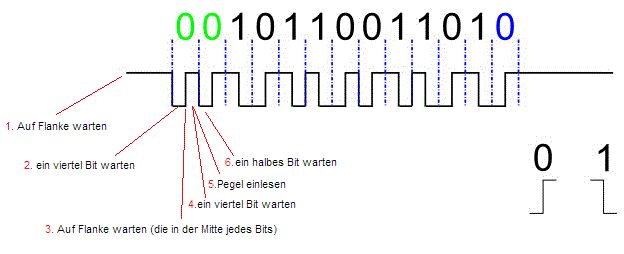 Bei mir läuft die Decodierung mit einer simplen Schleife so ab: Falls das Signal immer mit einer führenden "0" beginnt: Schritt 1 und 2 voraus, dann in einer Schleife Schritt 3 bis 6 für jedes Bit. Falls das Signal immer mit einer führenden "1" beginnt: nur die Schleife Schritt 3 bis 6 für jedes Bit Wird ein "high" Pegel eingelesen, war das Bit eine "0", bei "low" eine "1". Die "Auf die Flanke warten" Routine wird noch zusätzlich über einen Timer überwacht, damit bei Signalausfall oder Signalende nicht unendlich weitergewartet wird. Falls das Signal mit einer "1" oder "0" beginnen kann, wird es etwas komplizierter, da man dann erst im weiteren Signalverlauf entdeckt, welcher Pegel einer "0" bzw. einer "1" entspricht. Das Startbit hat aber meistens keine wechselnde Logik, sondern ist konstant.