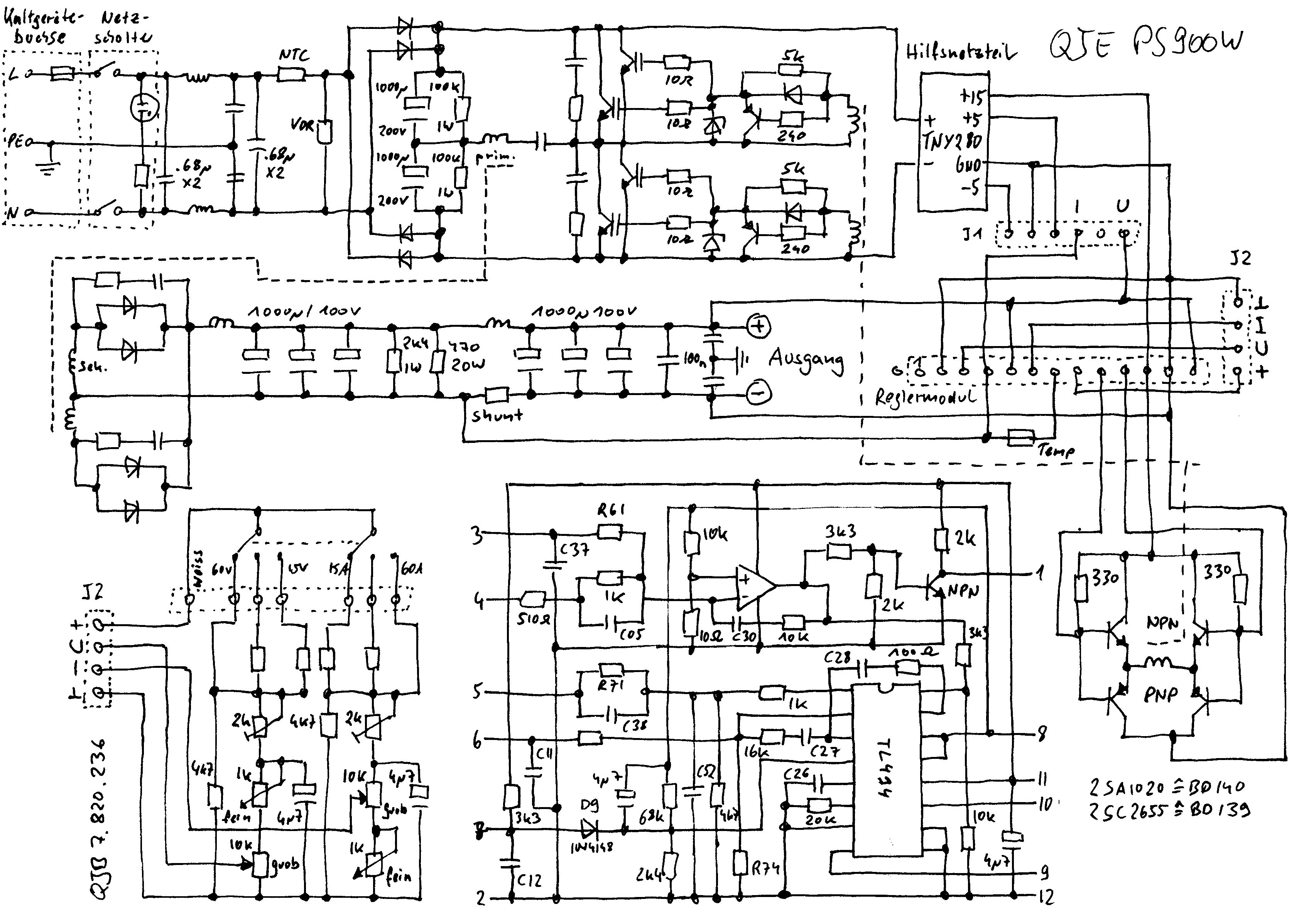Flip B. schrieb: > Mittlerweile nennt sich das Teil PS900W Nein, das PS900W ist anders aufgebaut, mit einem TL494, wie ich sehen musste. Mir ist ein Komerci QJE PS900W zugeflogen, das alte Modell im 19" Gehäuse, natürlich defekt wie es nach Kurzschluss im Betrieb passierte. So was muss ein Labornetzteil eigentlich aushalten, das Gerät ist also grosser Mist. Ich habe mir mal die Mühe gemacht einen Schaltplan abzuzeichnen, ohne Hilfsnetzteil und LED-Displays mit zu erfassen. Recht simpel gebaut, und eben wenig Sicherheitsmassnahmen (z.B. keine Primärstrommessung und Begrenzung, keine IGBT Stromverteilung). Auf der Hauptplatine sitzt eine Steuerplatine, leider festgelötet, man baut besser eine Buchen- und Stiftleiste ein damit man sie testen kann, und um die zu testen habe ich eine Testschaltung aufgebaut. Dann sieht man per Oszilloskop ob es richtig taktet. Defekt war lediglich D9, also eine eher einfache Reparatur, der grösste Ärger war die Platine bei der sämtliche Durchkontaktierungen mit den zu entlötenden Bauteilen rausrutschen. Vielleicht hilft es, vielleicht benutzt das aktuell bei Komerci unter PS900W verkaufte Netzteil dieselbe Schaltung im billigeren kleineren Gehäuse.