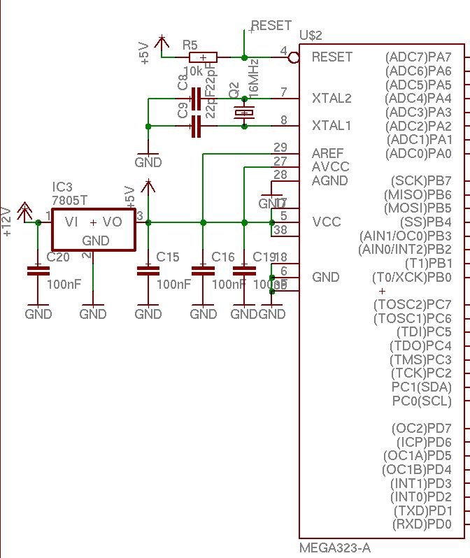 waere anliegende Schaltung denkbar um den Mega32 direkt ueber einen 12V Stecker des PC ATX Netzteils zu versorgen? (Das Netzteil wird auch noch vom PC benötigt, läuft also). IC3 ist Reichelt Bestellnr: "µA 7805" Spannungsregler 1A positiv, TO-220