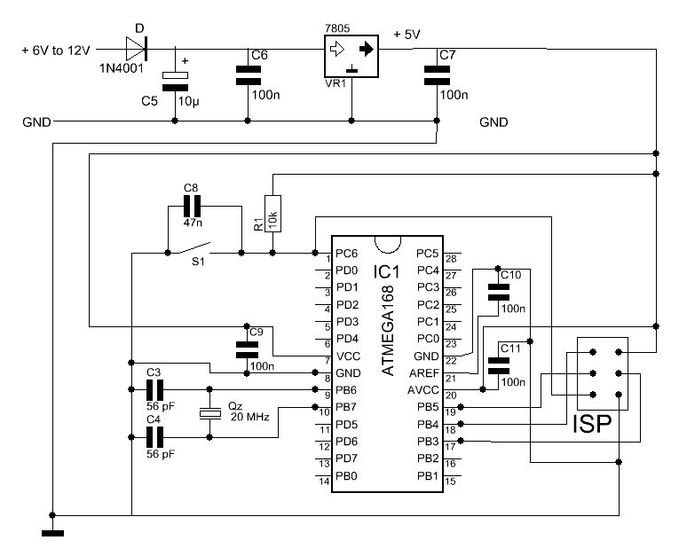 Kleinkram: 6V Eingangsspannung reichen nicht (an der Diode bleiben ja schon 0,7V hängen) und 56pF am Quarz kommt mir etwas viel vor (waren das nicht eher 22pF?).