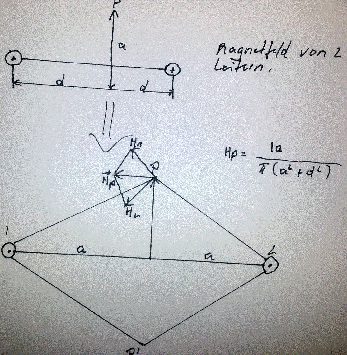 Hallo, rechne gerade verzweifelt das einfachste Beispiel von allen aus und komme auf keinen grünen Zweig. Im Bild seht ihr 2 Stromdurchflossene Leiter. Beide tragen den selben Strom in die selbe Richtung. Die einzelnen Feldstärken sind: