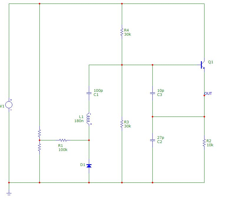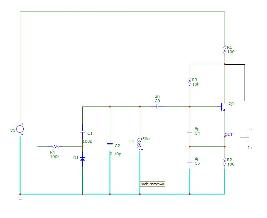 Ich würd ein wenig anders dimensionieren: R1 = 100 R2 = 1k R3 = 10k R4 = 100k C1 = 100p C2 = 5p (später für Bereich optimieren) C3 = 5p C4 = 4p C5 = 8p C6 = 1n L1 = 150nF Q1 = z.B. BF199 V1 = 5 Volt Vabstimm = 2 - ... Volt