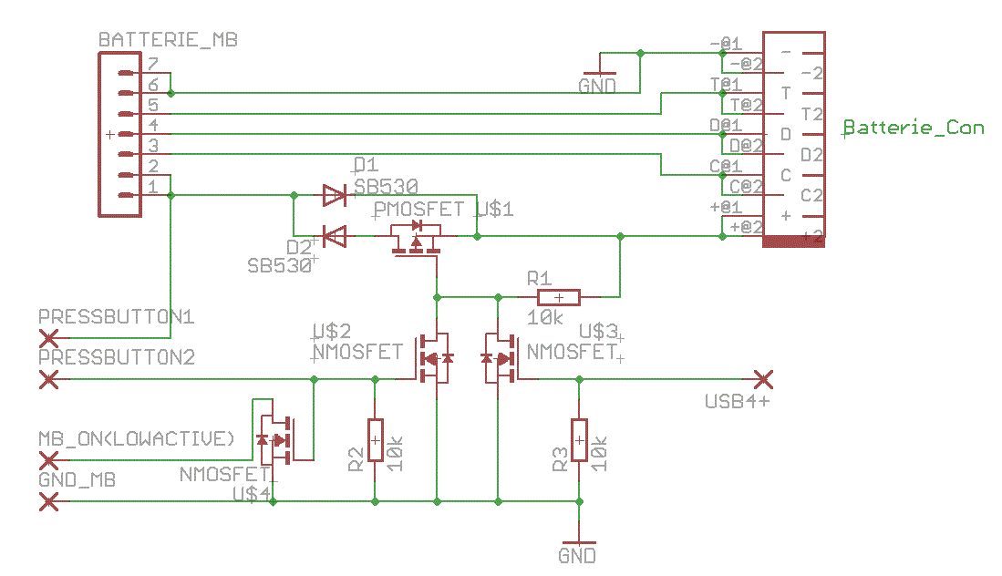 @Michael: Ich bin die Bios-Einstellungen mehrmals durchgegangen und habe alles was Strom brauchen könnte deaktiviert. Der Stromvergleich bleibt auch gleich wenn ich z.B. per Hard-Reset (5 Sec. auf Taster) ausschalte. Anbei noch die Schaltung, damit klarer ist, wo was angeschlossen ist. Über den Pressbutton wird U$4 und U$2 geschaltet, wodurch einerseits die Stromversorgung hergestellt wird und andererseits der On pin des Mainboard auf Masse gezogen wird, was das Gerät einschaltet. Sobald das Gerät an ist, liegt an USB4+ 5V an, was dafür sorgt, dass auch bei losgelassener Taste die Stromversorgung anbleibt. Wird das Gerät heruntergefahren sinkt Usb4+ auf 0V und die Stromversorgung wird gekappt. Wie gesagt, dieser Teil der Schaltung funktioniert bereits. Es geht mir nur darum, dass momentan nicht über 84% Akkuladung komme. Ich habe den Spannungsabfall an der Diode in Verdacht, weiß aber keine andere/bessere Lösung. Grüße, Markus