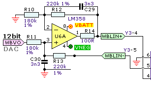 Hallo, da ich mit OPVs immer so ein bisschen auf Kriegsfuß stehe, wollte ich mal fragen ob mir jemand die angehängte Schaltung erklären kann. Hintergrund der Frage ist, das ich eine Ausgangsbeschaltung habe die ich nicht ändern kann. Diese gibt mir eine Spannung zwischen 0-5v aus und ist recht hochohmig. Ich würde also gerne die angeängte Schaltung 1. verstehen (man will ja lernen) und 2. so modifizieren das sie einen Verstärkungsfaktor von 1 hat aber trotzdem die Möglichkeit bietet über den WBLIN- Eingang unterschiedliche Massepotentiale zu korrigieren. Eine evtl. leichte Tiefpassfilterung wäre ebenfalls noch sinnvoll. Sehe ich das richtig, das diese schon über R11 und C30 in der angehängten Schaltung realisiert ist? R14 dient ja nur als Kurzschlussstrombegrenzung. Könnte ich den ohne Rückwirkungen auf die Schaltung entfernen bzw. verkleinern um den Ausgang niederohmiger zu machen? insb. bei kleinen Ausgangsspannungen wäre das Sinnvoll. Vielen Dank