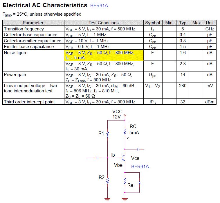 Hallo, ich versuche einen kleinen linearen RF verstärker und vielleicht VCO mit dem BFR91A zu basteln. http://www.hft.tu-berlin.de/fileadmin/fg154/HFT/Labor/BFR91A-VISHAY.pdf Ich habe viel Theorie über der Arbeitspunkteinstellung der Transistor gelesen und einige Videos im Youtube gesehen, aber leider wenn ich in der Praxis eingehen will, finde ich einige Unklarheiten. Für AC signal Verstärker habe ich die folgende Tips zusammengefasst: VCE= 0,5.VCC Re= 0,1.Rc (laut Europa Lehrmittel, Fachkunde Elektrotechnik, 25 Auflage, S202 Stabilisierung des Arbeitspunktes) Im folgendem Artikel allerdings http://www.qsl.net/va3iul/Bias/Bias_Circuits_for_RF_Devices.pdf habe ich erfahren über wichtige Anhaltspunke vom Transistorblatt zum Arbeitspunkt Einstellung und Betriebsfakten nämlich: Ft, Nf, VCE und Ic so das ich einen Kompromiß zwischen höchste Bandbreite bzw Gewinn und klirrfaktor Nf einwähle. Jetzt ich weiß nicht wo ich anfangen soll beim komzipieren und dimensionieren von der Schaltung z.B wenn ich die folgende daten haben will, soll ich zuerst den Kollectorwiderstand berechnen?? VCC: 12V Ic 5mA Vce 8V wie berechne ich Rc bzw Re so das Vce 8 volt ist? Zusammen gefasst: wie fange ich mit den Berechnungen so das ich einen linearen einstufigen Verstärker bauen kann wo Vce 8V sein soll und Ic bzw Ie 5mA? Danke im Vorraus