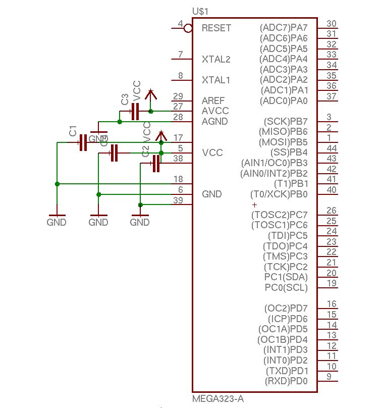 In der AVRgCC Checkliste lese ich vier Abblockondensatoren fuer den Mega16A, habs jetzt mal fuer den Mega32A gemacht... ist die Beschaltung so korrekt?