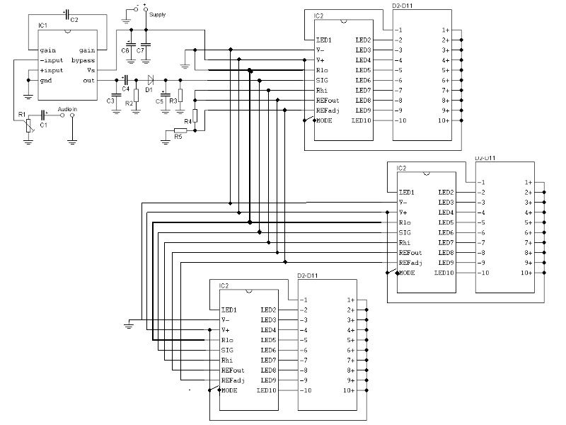 Maximales Ausgaungssignal des LM386 < 12 Vpp Gleichgerichtet: < 6 Vp Schwellspannung des Gleichrichters (1N4148) = 0,6 V 6 V / 0,6 V = 10 Umgerechnet in dB: 20 * log(6/0,6) = 20 dB Damit ist schon EIN LM3915 unterfordert...