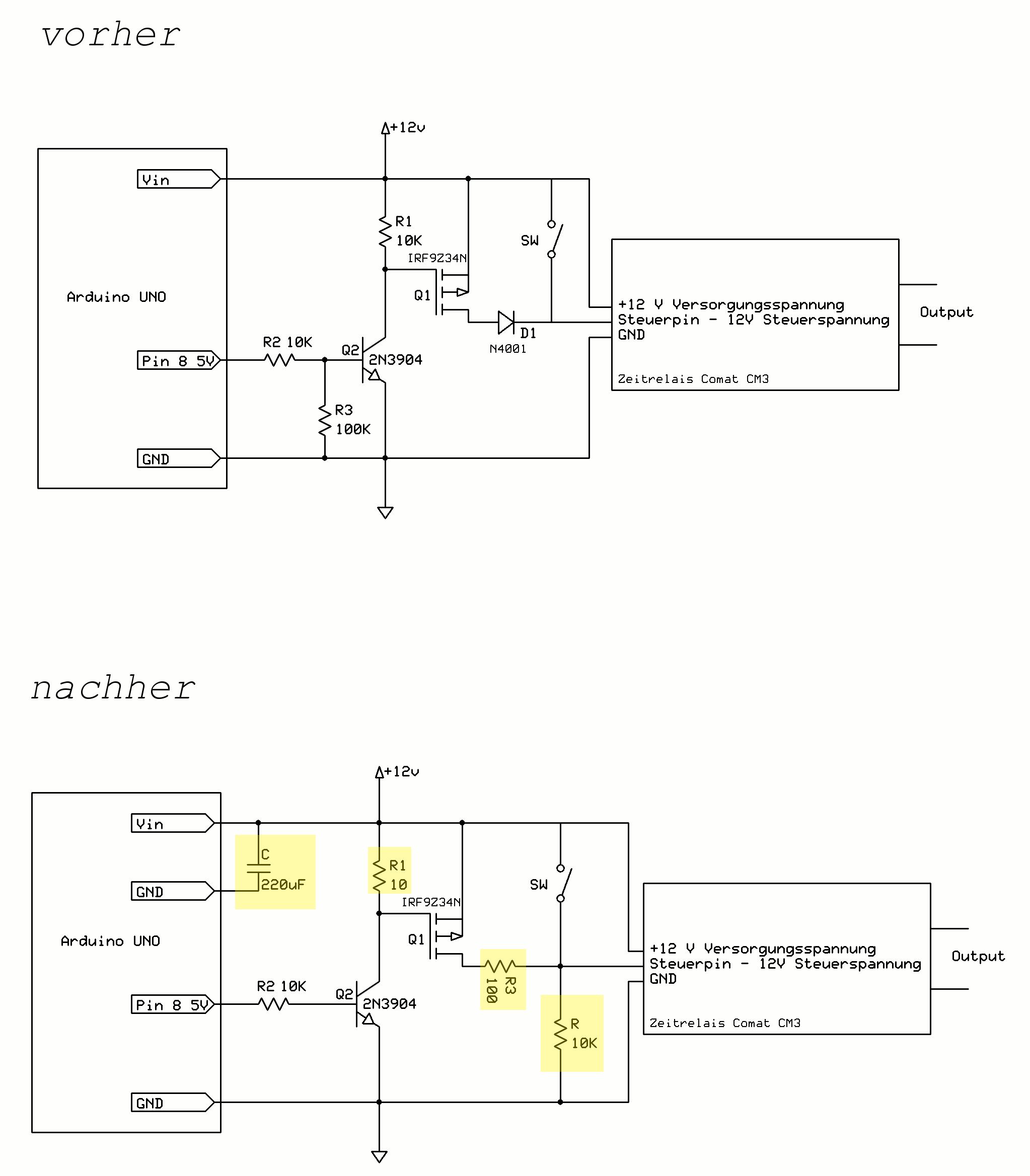 Liebes Forum! Ich bin als postender User neu hier und (leider) kein ausgebildeter Elektrotechniker. Trotzdem ist es mir gelungen nach intensiver Recherche - hauptsächlich hier im Mikrokontroller-Forum - einen P-Mosfet highside-switch angesteuert durch einen Arduino (UNO) zusammenzuschustern. Bevor ich zu meinem eigentlichen Problem komme beschreibe ich hier kurz was die Schaltung eigentlich tun soll (Schaltplan ist angehängt): 1) Ziel ist es in einem bestehenden System, das mittels Zeitrelais geschalten wird mit einem Arduino den Zyklus des Zeitrelais zu starten. 2) Der Arduino wertet die Signale eines Flowmeters aus und gibt bei positiven Ergebnis über den Pin 8 für 500 ms Output = HIGH (Software und Sensorauswertung kann ich als Fehlerquelle ausschließen, funktioniert einwandfrei, 1000 mal debugged). 3) Am Pin 8 hängt ein Highside-Switch auf einem P-Mosfet basierend. Schaltet der Switch wird auf dem Steuerpin des Zeitrelais +12V angelegt - Zyklus des Relais startet. Weitere Umweltbedingungen. Stromversorgung kommt von einer nassen 12V Bleibatterie mit 65 Ah Kapazität. Arduino und Zeirelais und Verbraucher die durch das Zeitrelais geschalten werden (hauptsächlich Solenoide) hängen alle an der selben Batterie. Zeitrelais --> COMAT CM3. Die Datenblätter verraten nicht viel. Bestimmt wird jedoch mit dem Steuerpin NICHT die Relais-Spule getrieben. Den fertigen Aufbau (lochplatinen-shield für den arduino) habe ich getestet. Funktioniert mit allen Verbrauchern am anderen Ende einwandfrei. jedoch nur für 15 Minuten... Und damit komme ich gleich zum PROBLEM: 1) Das System verrichtet seine Arbeit einwandfrei für 15 Minuten, danach beginnt mir zunehmend der Mosfet zu "floaten" (?). 2) Die Spannung von Drain --> Gnd rauscht dann wild zwischen 5 und 11 Volt herum und schaltet mir damit zeitweise das Relais. 3) Bei positiver Sensorauswertung Schaltet es jedoch noch immer zuverlässig und geht zurück in den rauschenden Zustand. Folgende Messungen und Feststellungen bei der Problemsuche kann ich noch schildern: 1) Arduino-reset --> keine Änderung 2) Mosfet (Q1) und NPN-Transistor (Q2) bleiben kühl 3) Arduino Pin 8 --> Gnd = 0 V (passt so, da ja nicht im Schaltzyklus) 4) Mosfet Voltage Gate --> Gnd ident zu Source --> Gnd (damit sollte er ja ordentlich sperren?!?) 5) Blei-Säure-Batterie (nass) ist tiefentladen oder kaputt (11,5 V im Leerlauf) hat aber noch genug Dampf um gesamt 30 W kurzfristig solide zu powern. Mir ist bewusst, dass das Ansteuern eines Zeitrelais mit dem Arduino grundsätzlich schonmal absurd wirkt. Ist es auch. Sind aber leider meine Rahmenbedingungen die ich nicht verändern kann. Die Batterie wird demnächst getauscht, schließe ich aber auch als Ursache aus, oder? Verzeiht den vielen Text, will das Problem jedoch so ausführlich wie möglich schildern. Fällt euch was ein? Ich bin am Ende meines leider ohnehin recht begrenzten Lateins und kurz vorm Verzweifeln... Hab ich was beim Layout der Schaltung verbockt? Ist der MOSFET kaputt? (dann sollt er aber garnichtmehr schalten, oder)? Hab ich was übersehen? Hätt ich doch Elektrotechnik studieren sollen? Vielen Dank schon im voraus für eure Hilfe! Lukas
