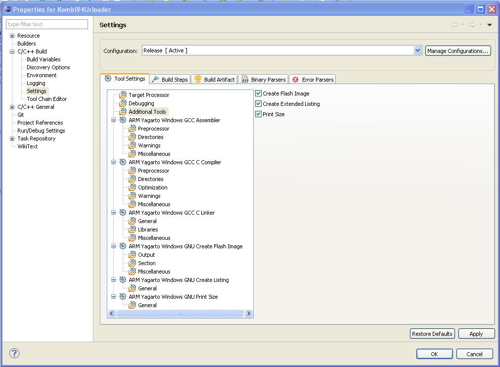 Moin, ich bräuchte Hilfe zum Release vom Quellcode. Debug funktioniert prima....nach langer Arbeit. Nun möchte ich die Hex-File aufspielen, bekomme aber definitiv keine heraus. Ich vermute den Fehler in den Settings, da mir auch kein Listing und keine Codegröße angezeigt wird. WARUUUUUUM übernimmt Eclipse nicht diese Settings(grüne Häkchen) für Yagarto? Danke.