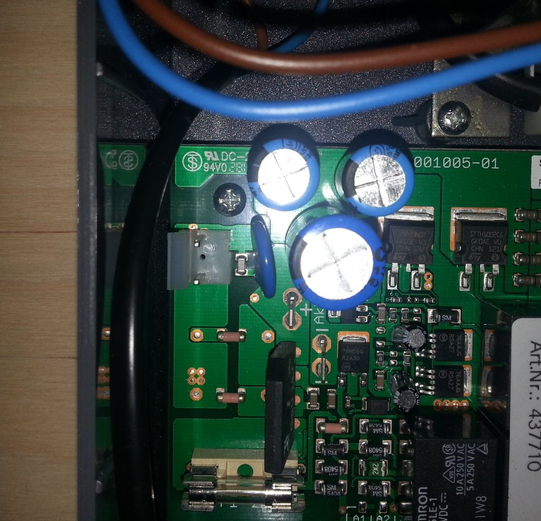 Hier noch ein Bild der Steuerung. Links sind die beiden Pins, wo der Ausgang des Transformators angeschlossen wird. Der Grund des Ausfalls ist uns leider nicht bekannt. Von einem Tag auf den anderen fuhr das Tor nicht mehr auf. Da wir die Steuerung mit dem Netzteil (vorübergehend) in Betrieb nehmen können und keine Spannung an der Ausgangsseite des Trafos messen, gehen wir davon aus, dass dieser defekt ist.