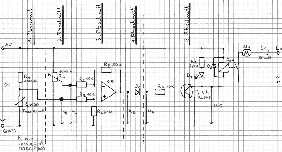 Hallo Fabian, als erstes solltest du die das zentrale Element ansehen. Dies ist der Operationsverstärker, welcher als Differenzverstärker mit einer Verstärkung von V=5 ausgelegt ist. Ich gehe jetzt mal die einzelnen Abschnitte von dir durch. 3. Abschnitt: Differenzverstärker U3 = (U1 - U2)*(R5/R3) = (U1 - U2)*5 da R5=R6 und R3=R4 1.Abschnitt: Zunächt bildet der Vorwidertsand R1 einen Spannungsteiler mit der Parallelwiderstand PT1000 || (R4 + R6). Da R4+R6 gegenüber den 1kOh, des PT1000 sehr hochohmig sind, kann der Strom durch dieser vernachlässigt werden. Der Spannungsteiler kann daher auf R1 und den PT1000 reduziert werden. Je nach Temperatur ergibt sich somit eine entsprechende Messspannung U1. Der Strom, welcher maximal durch den PT1000 fließen kann liegt bei 0 Grad Cel. Imax = 5V/(R1 + 1000). 2. Abschnitt: Hier wird die Spannung U2 erzeugt, welche von der Temperaturmessspannung U1 im 3.Abschnitt subtrahiert wird. Also lediglich ein Offset abgezogen, je nach Stellung des Potentiometers R2. 4.Abschnitt: Leider ist der Operationsverstärker nicht angegeben. Ich gehe davon aus, dass hier kein Rail-to-Rail verwendet wird (Ausgangssignal kann bis an pos./neg. Betriebsspannung gehen), kann dieser ein Ausgangssignal typischerweise von 0V+ 0.5V und 5V-0.5V liefern. Da,ist der nachgeschalteter Transistor geschlossen werden kann, muss die Spannung an der Basis kleiner 0.7V betragen. Mit der Diode D1 wird dem Ausgangssignal 0.7V abgezogen, da diese an der Diode abfallen. Der Transistor wird demnach leitfähig, wenn der Operationsverstärkerausgang 1.4V erreicht. 5.Abschnitt: Ist der Transistor offen (Spannung an der Basis < 0.7V), ist U5=5V. Wird er durchgeschalten, wird U5 auf 0.7V reduziert (Diode im Transistor bleibt vorhanden). Es kommt zum Stromfluss durch das Relais und die LED mit ihren Vorwidertsand R8. Die LED leuchtet und das Relais verbindet den Motor mit dem Nullleiter N. Der Motor läuft. Quizfrage: Was genau macht R2? Mit R2 lässt sich die Temperatureinschaltschwelle des Motors einstellen. Soll dieser bei einer Temperatur x anlaufen, muss der entsprechenden Temperaturmessspannung U1 ein Offset subtrahiert werden, bei dem der Operationsverstärkerausgang ca. 0.7V beträgt. Mit steigender Temperatur steigt U1 und der Motor läuft. Sinkt die Temperatur, sinkt auch U1. Fällt diese soweit, dass U3<1.4V erreicht wird, öffnet der Transistor, das Relais wird nicht von einem Strom durchflossen, öffnet den Stromkreis und der Motor stoppt. So solltest du in Zukunft an deine Schaltungen ran gehen, zuerst das zentrale Element analysieren und dann rundherum weitermachen. Gruß Alex