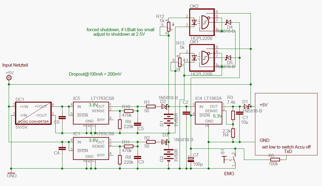 Hallo zusammen, ich hoffe ich bekomme hier eine Auskunft, die ich trotz tagelanger Recherche nicht im Internet finde, bzw. finde ich widersprüchliche Aussagen. Ich möchte mir eine USV mit Li-Ion Akkus bauen um kurzfristig den Raspberry Pi zu versorgen, bis er ordnungsgemäß runtergefahren ist oder das Netz wiederkommt. Dazu habe ich die Frage ob man einen Li-Ion Akku mit einer konstanten Spannung von z.B. 3.8V permanent laden kann. Der Strom wird auf ca. 100mA durch einen Widerstand begrenzt, wenn der Akku 0V hätte. Natürlich wird die USV bei Erreichen der unteren Entladespannung von z.B. 3V abgeschaltet. Wenn also die Konstantspannung deutlich unter der max. Floatspannung = 4.2V liegt, sollte sich doch der Strom bei Erreichen dieser Spannung auf 0 reduzieren und nur die natürliche Selbstentladung kompensiert werden. Allerdings finde ich nirgends ein solches Ladeszenario für Li-Ion. Warum nicht? Was kann schief gehen? Die Selbstentladung sollte ja bei 3.8V Ladeentspannung auch ziemlich gering sein. Die Kapazität ist dann zwar auch gering (40%-60%), aber für meinen Zweck sollte es reichen.Und physikalisch verstehe ich nicht was der Unterschied ist zwischen a) abschalten wenn z.B. 3.8V erreicht sind, warten bis die Selbstentladung die Spannung auf z.B. 3.6V gebracht hat und wieder bis 3.8V aufladen b) kontinuierlicher Prozess wie beschrieben mit U=const=3.8V permanent a) geht ja in b) über wenn Delta-U zwischen aufhören und wieder anfangen mit laden immer kleiner wird. Bevor Fragen dazu kommen : ich schalte zwei Akkus in Serie für die Entladung und lade sie aber unabhängig auf, sprich ein DC/DC Wandler zur galvanischen Trennung für den oberen Akku und 2 Spannungsregler von 5V auf 3.8V und einen Spannungsregler von 7.6V auf 5V für den Raspberry, natürlich mit Schutzdioden und Shutdown Features usw. Im Anhang einen ersten Schaltplanentwurf. Das geordnete Runterfahren ist noch nicht drin, ich müsste detektieren, ob der 5V Regler Strom liefert. Da habe ich gute Erfahrungen mit Reedkontakten und "Stromspulen" gemacht (wenige Wicklungen -> geringer Widerstand, aber viel Strom). Sollte für ca. 1A gut machbar sein und trennt galvanisch. Sicherungen sollten eventuell auch noch rein. Gruß Rainer P.S. Sorry für das zweite Bild, weiß aber nicht wie man es löscht :(