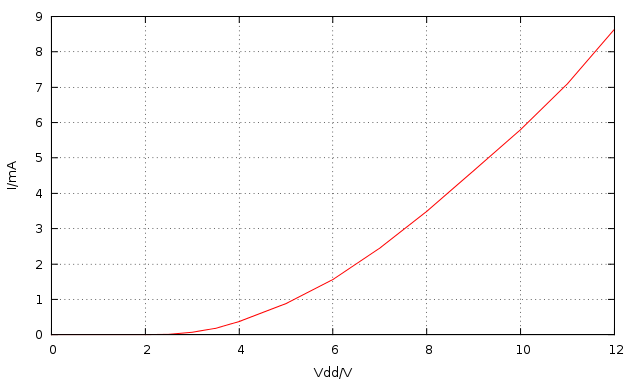 Natürlich leiten beide Mosfets, wenn die Kontakte offen sind. Das Gate-Potential – und damit auch das betragsmäßige Ugs beider Mosfets – liegt in diesem Fall ziemlich genau bei Vdd/2. Das Ugsth dieser Mosfets beträgt etwa 1V (wäre es höher, würde das IC bei der im Datenblatt angegebenen minimalen Versorgungsspannung von 3V nicht sicher funktionieren). Damit die Mosfets sperren, muss die Versorgungsspannung der Schaltung unter 2·Ugsth = 2V liegen. Die Schaltung wird aber mit 9V betrieben, also beträgt das Ugsth für den P-Mosfet -4,5V und für den N-Mosfet +4,5V, was locker ausreicht, um beide Mosfets durchzuschalten. Am Verhalten der LEDs ändert sich dadurch aber nichts, nur am Stromver- brauch der gesamten Schaltung. Ich habe mal den Strom durch die Mosfets in Abhängigkeit von der Versor- gungsspannung gemessen (s. Anhang). Bei Vdd=9V fließen immerhin schon etwa 4,6mA. Hier sieht man auch schön, warum ein zu langsamer Anstieg der Eingangssignale von CMOS-ICs zu einem stark erhöhtem Stromverbrauch führt.