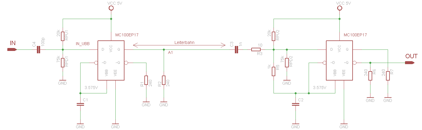 HEy Leute ich brauche eine Verstärkerschaltung für HF Impulse basierend auf ECL (mit Schaltkreis MC100EP17). Die Schaltung im Anhang zeigt den Aufbau, welcher theoretisch und in der Simulation funktioniert. Die Signalverläufe sind im Anhang Das Signal wir zuerst DC entkoppelt um den Arbeitspunkt auf theoretisch UD=0V zu bekommen. Hierfür wird ein DC rebias nötig. dieses will ich durch einen externen PULLUP Widerstand (RPU1) und den internen (hier extern dargestellt) PULLDOWN Widerstand RPD1 erlangen. Die Differenzverstärkung des Schaltkreisen bewirkt die VErstärkung des grünen Verlaufes zum blauen. Über eine Weitere AC Kopplung wird das Signal zur Zweiten Verstärkerstufe weitergereicht. hier wird wieder ein rebias vorgenommen. und eine Verstärkung bewirkt den roten Verlauf. soweit alles wie gewollt. jetzt zum real life. die kopplung solcher und aller anderen hf-schaltkreise bedarf einer signalterminierung um reflexionen zu vermeiden. da ich beide ac koppel, um wie gesagt den arbeitspunkt zu definieren, übernimmt der koppelkondensator diese aufgabe?! aber wie kann ich mir das vorstellen? angenommen die leitung zwischen dem ersten IC und dem C3 ist unter der kritischen länge von lambda/10, dann stellt doch der C3 und R3 die impedanz dar? oder anders ausgedrückt, wie beeinflusst die leiterbahnlänge die funktion der schaltung? danke für eure hilfe!