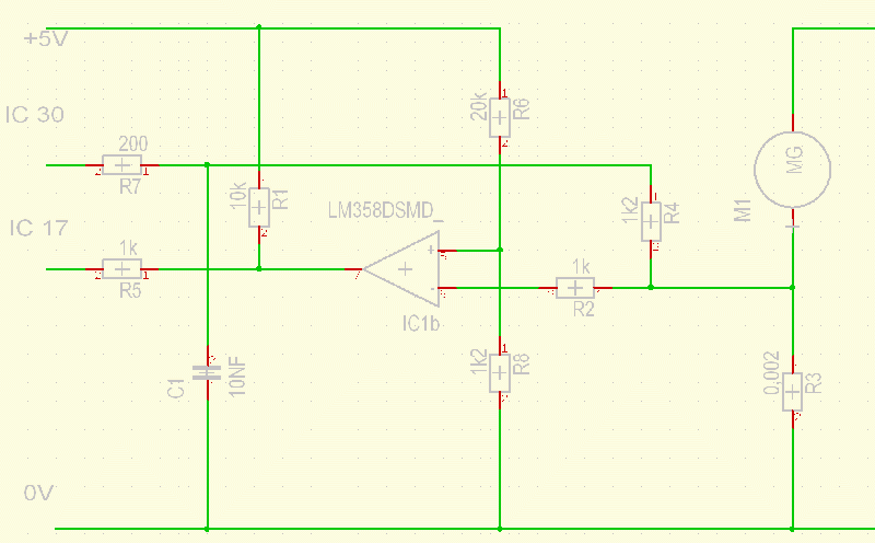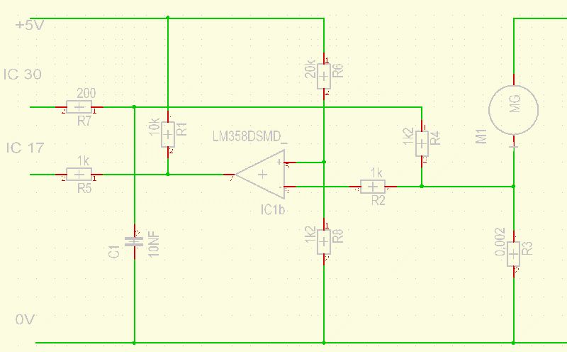 Hallo, ich habe die schaltung von einer Platine nachgezeichnet. Die schaltung misst über einen Shunt den Strom vom Motor. Die Spannung wird in den 358 geschickt der so beschalten ist. Es gehen dann och 2 Leitungen zum Controller IC auf der Platine. ich möchte seperat mit einem Mega8 den Strom auch messen. Ich hab mich an den Pin 17 des Controllers angeklemmt aber hier kommt wenn kein strom durch den Motor fließt schon fast 5V an. Was am Pin 30 des Controllers passiert weiß ich leider nicht. Wie verhällt sich nun diese Schaltung? Wird die gemessene Spannung verstärkt? Michi