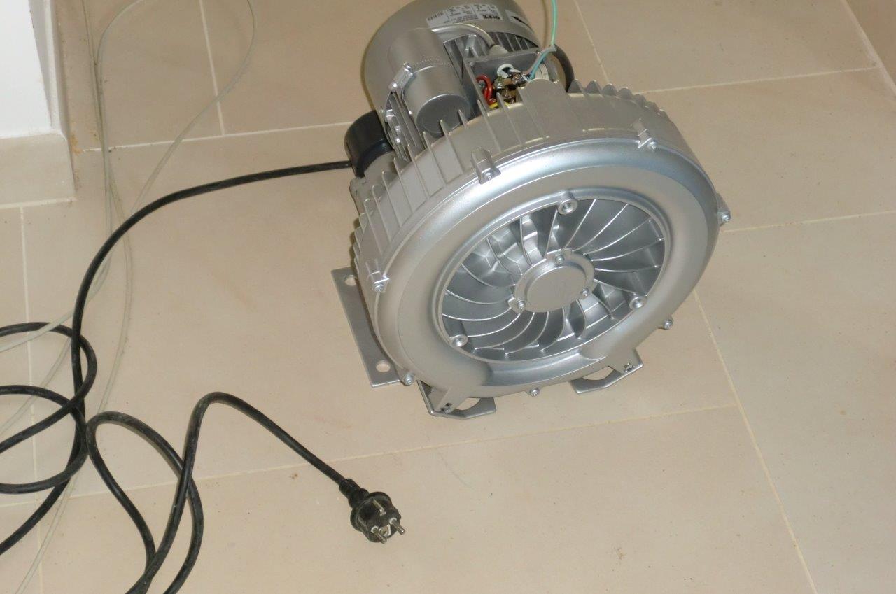 >>>Wenn Du eine Taste drückst, wird über ein Relais ein Motor angesteuert, der nur solange läuft, wie die Taste gedrückt wird. Fast so, einmal drücken schaltet um. (Flip-Flop ähnliche Funktion) Also Taste drücken: Relais geht an, LED in Taste leuchtet. Noch mal Taste drücken: Relais geht aus, LED in Taste leuchtet nicht. Nach ca. 5 Min würde ich das alles von außen zurücksetzen, damit die Pumpen nicht zufällig starten und dann über Tage laufen. Da kann ja auch mal ein Hund oder eine Katze drauftreten und alles läuft dann tagelang. Ich habe mal ein Foto von der Luft-Pumpe angehangen. Das Ding wiegt ca. 28 KG.