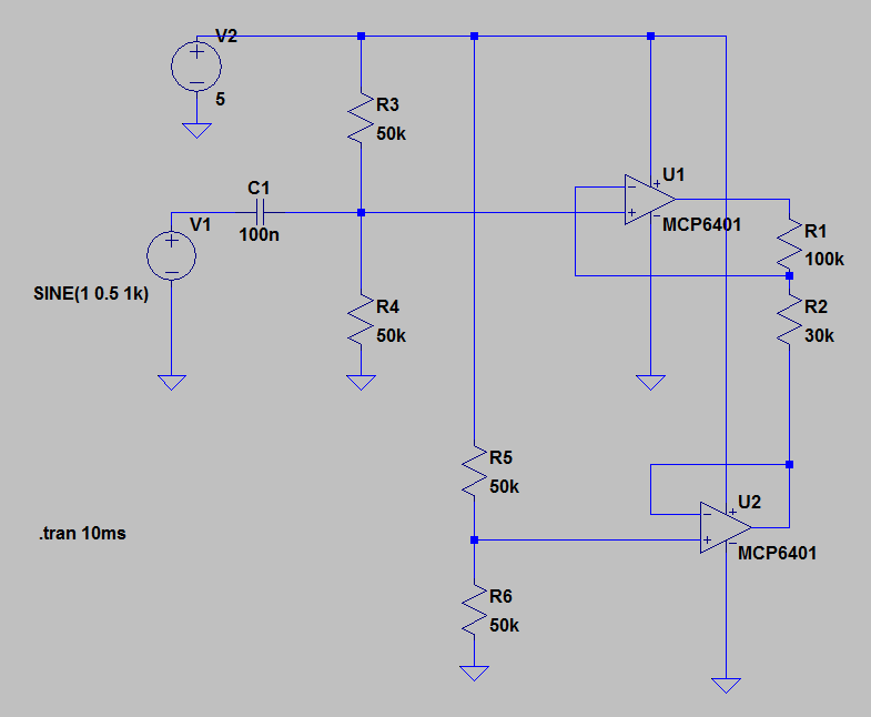 Hallo, Ich habe ein Signal, welches mittels PWM und anschließender RC-Tiefpassfilterung entsteht (vgl. Abb Eingang.png). Dieses Signal möchte ich verstärken, so dass es ein Offset von 2,5V besitzt und eine Spitzen-Spitzen-Spannung von etwa 4,6V hat (D. h. das Signal soll zwischen 0,2V und 4,8V liegen). Auf eine negative Hilfsspannung würde ich gerne verzichten. Der Ausgang der Schaltung wird mit nur etwa 100kOhm belastet. Dazu habe ich mir die Schaltung in Bild schaltung.png (auch in schaltung.asc) überlegt. Anstelle des Controllers mit Tiefpass habe ich einfach stellvertretend eine Spannungsquelle mit Sinus-Funktion eingebaut. Im Simmulator läuft das ganze, ich bin jedoch unerfahren mit Operationsverstärkern und habe diese Schaltung auch nirgends im Netz gefunden. Deshalb würde mich über kritische Kommentare sehr freuen. Kann meine Schaltung auch in der Realität funktionieren? Gibt es eine einfachere Möglichkeit, mein Signal zu verstärken? Vielen Dank und viele Grüße Michael