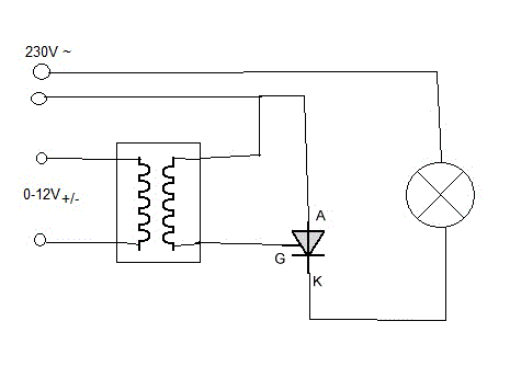 Deine Vorstellung und Schaltung sind vollkommener Unsinn. Du weisst offenbar werde wie ein Thyristor funktioniert, noch was eine Phasenanschnittsteuerung macht. So baut man das (mit TRIACs) http://www.hoelscher-hi.de/hendrik/light/analogdimmer.htm oder so (sogar mit Thyristoren) http://www.call-n-deal.de/uwe/projekte/stagelightning/pp785/pp785.gif und wundere dich nicht über die Vielzahl der Bauteile, an denen erkennst du nur, wie weit deine einfache Theorioe von der Praxis abweicht.